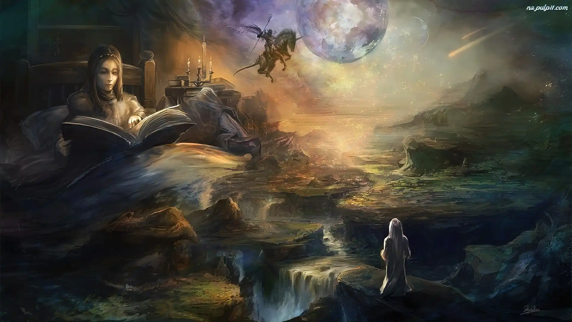 Jednorożec, Książka, Dziewczyna, Łóżko, Ksieżyc