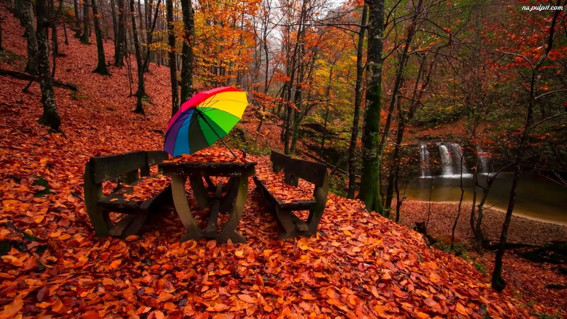 Jesień, Parasol, Ławki, Liście Na Pulpit