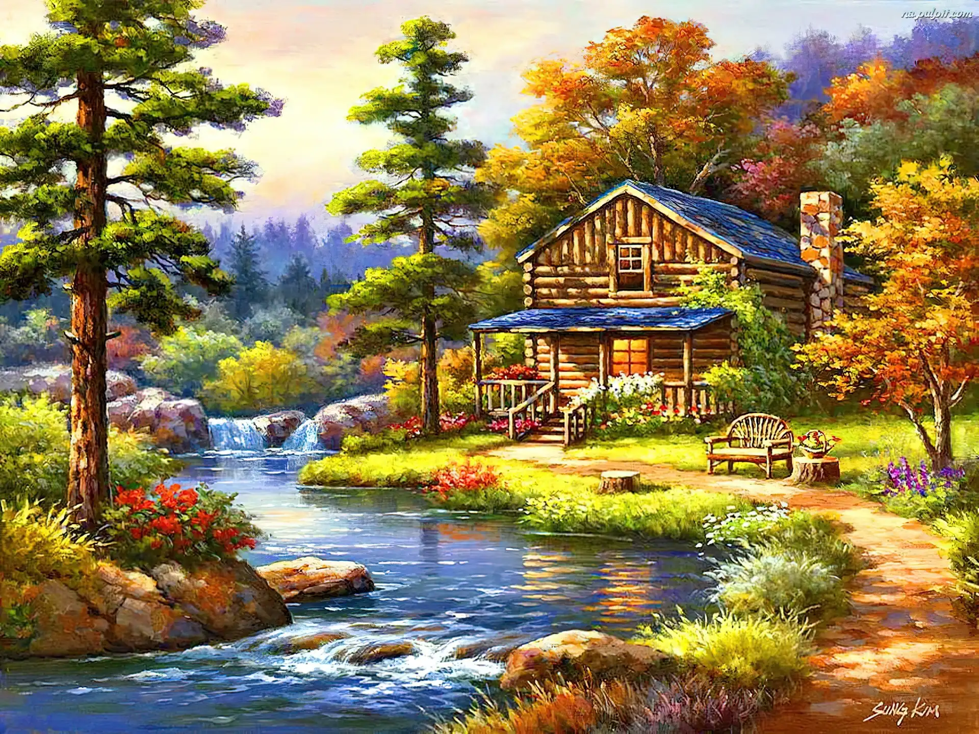Jesień, Rzeka, Dom, Dróżka Na Pulpit