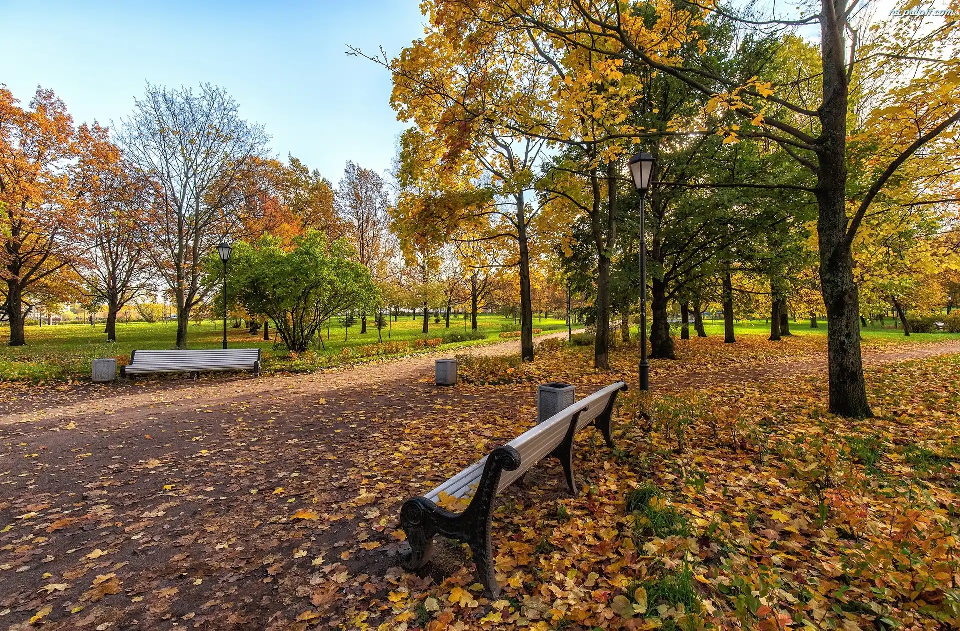 Ławki, Drzewa, Park, Jesień, Alejka