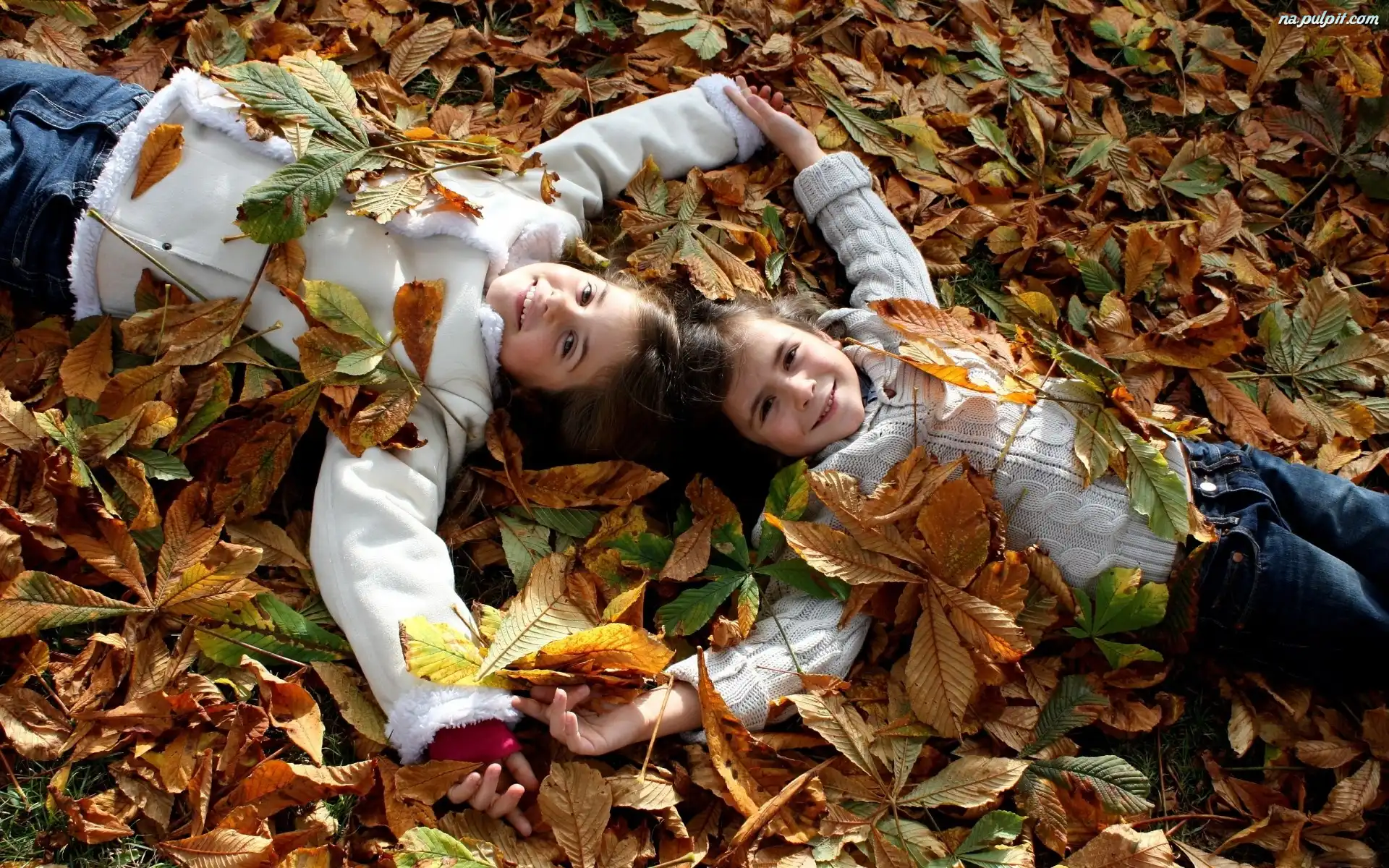 Jesień, Dziewczynki, Dwie, Liście Na Pulpit