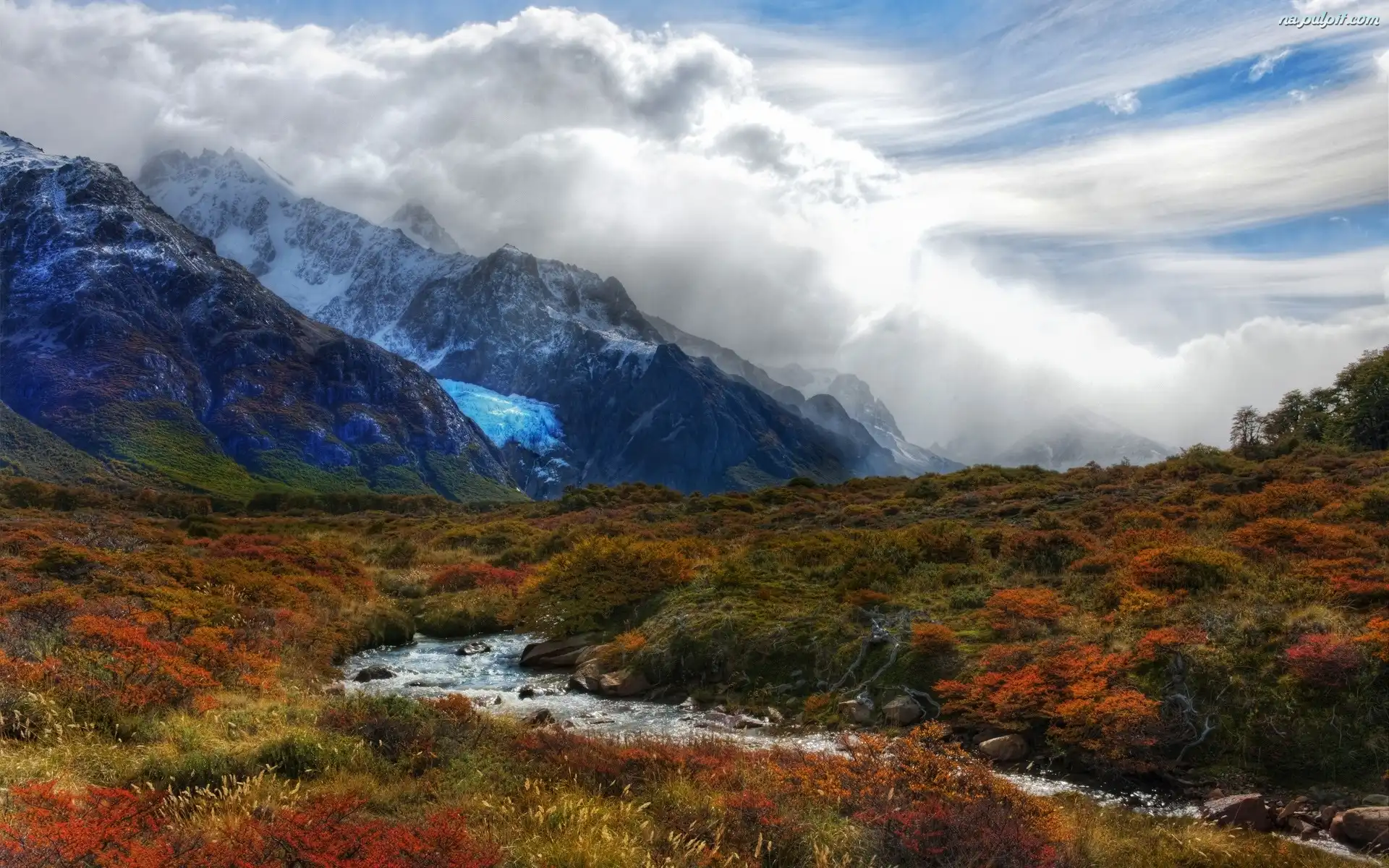 Jesień, Strumyk, Chmury, Góry, Krzewy Na Pulpit