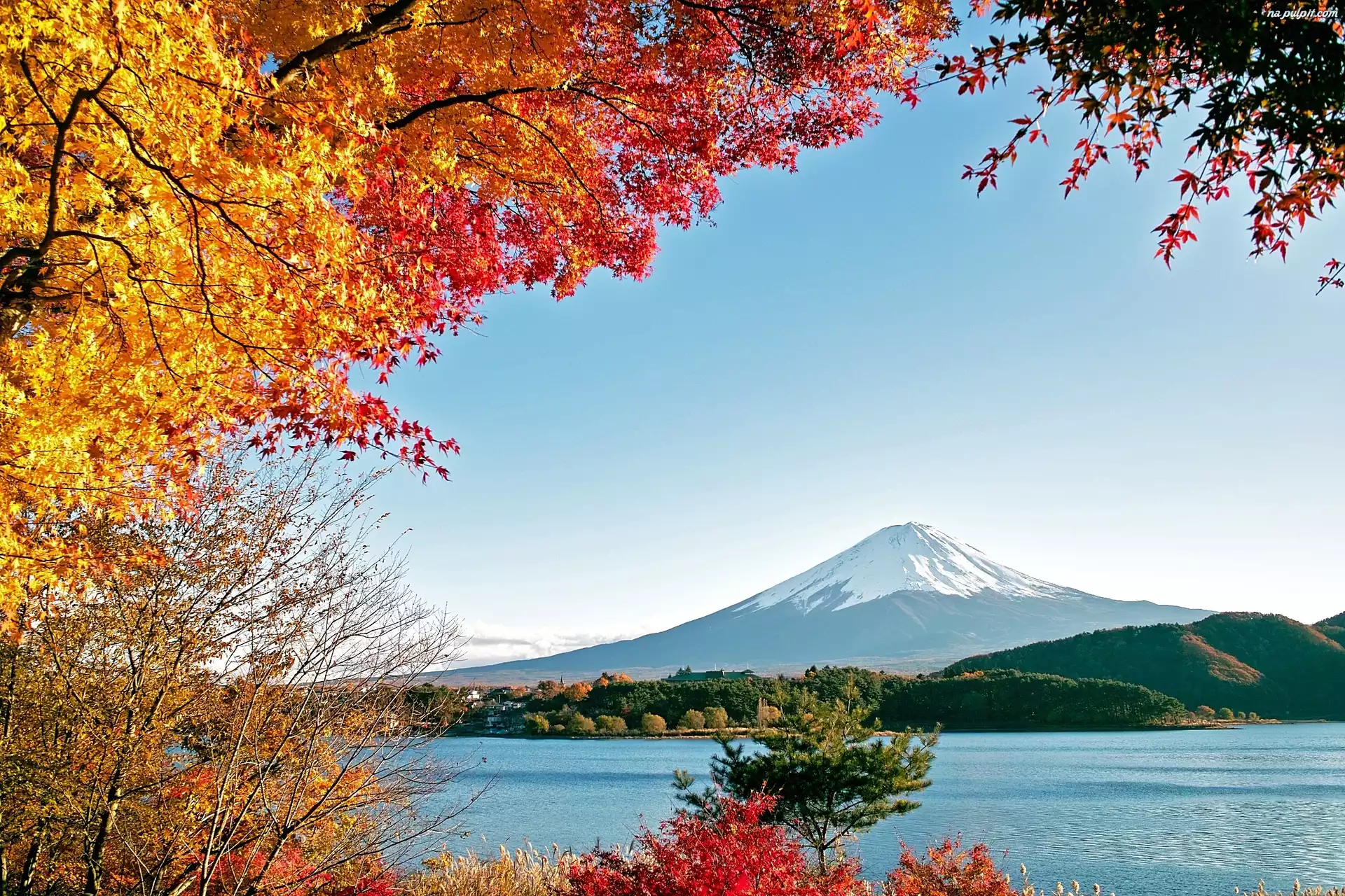 Jesień, Jezioro, Góry, Drzewa