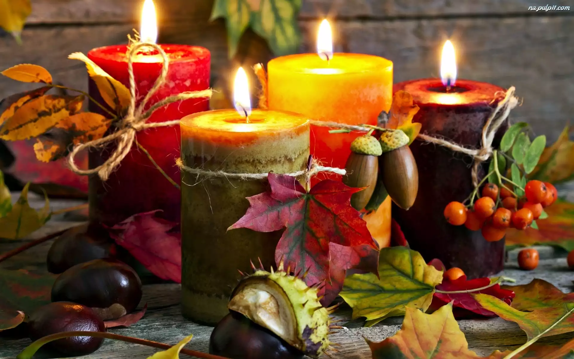 Jesień, Świece, Kolorowe, Kompozycja, Liście Na Pulpit