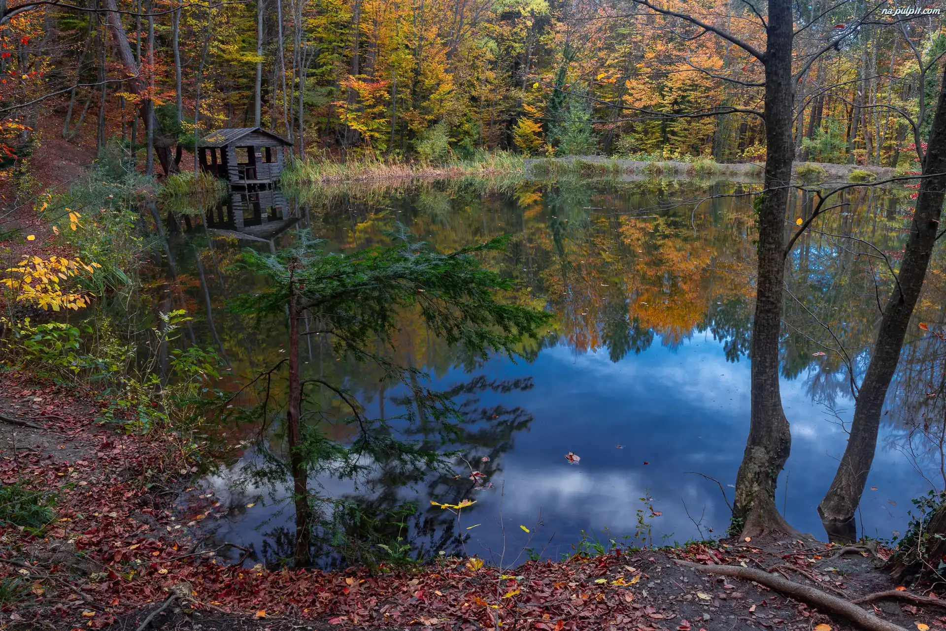 Jesień, Jezioro, Drzewa, Las, Altanka