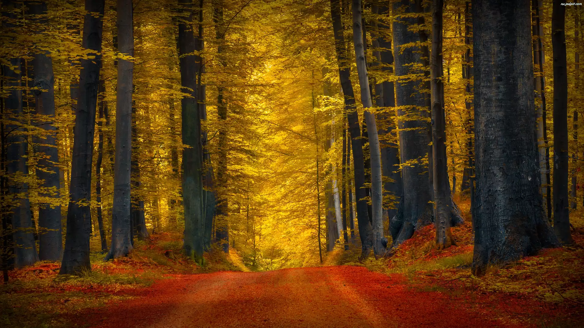 Jesień, Drzewa, Pożółkłe, Las, Droga