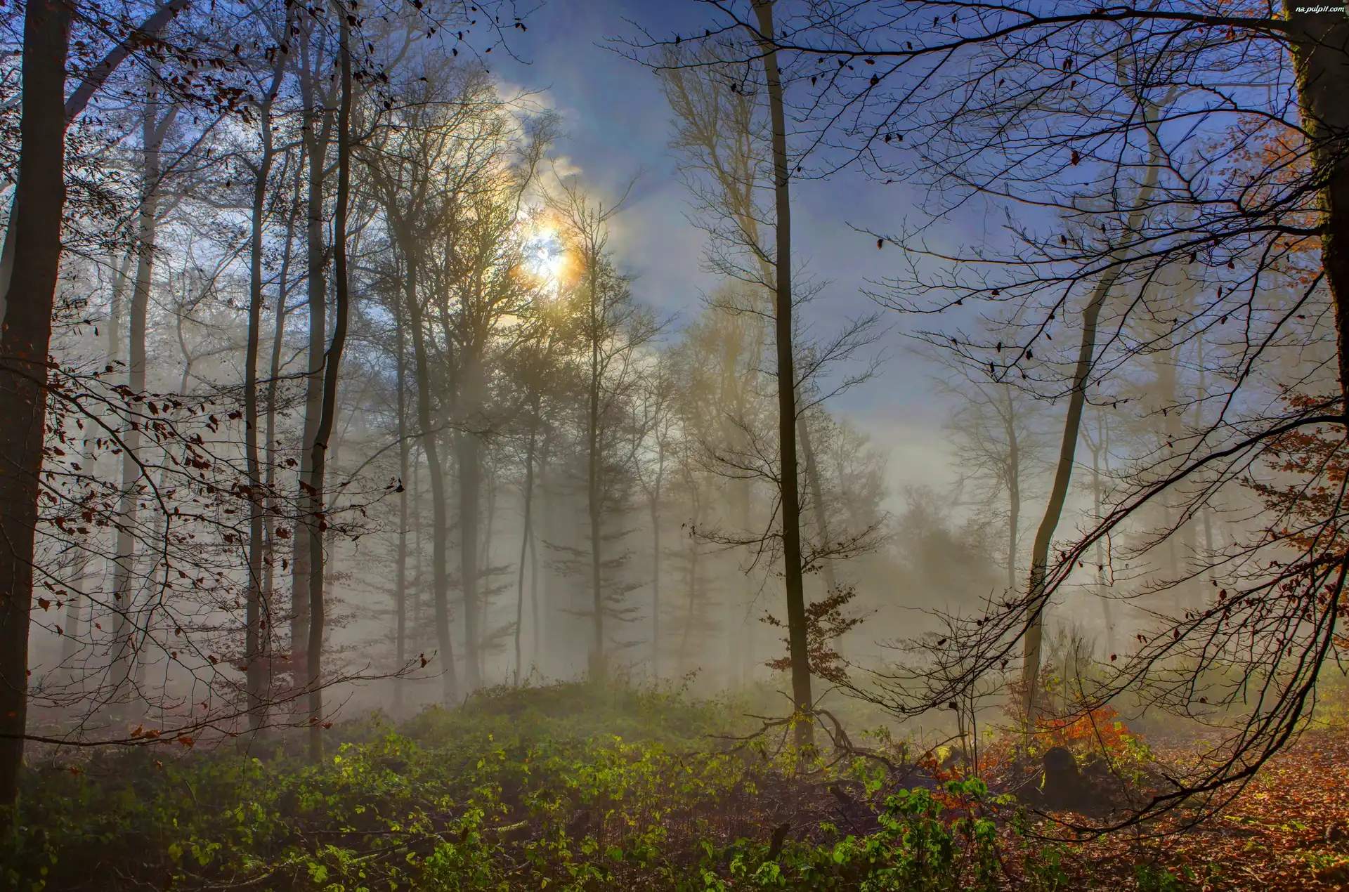 Światło, Mgła, Las, Jesień, Przebijające