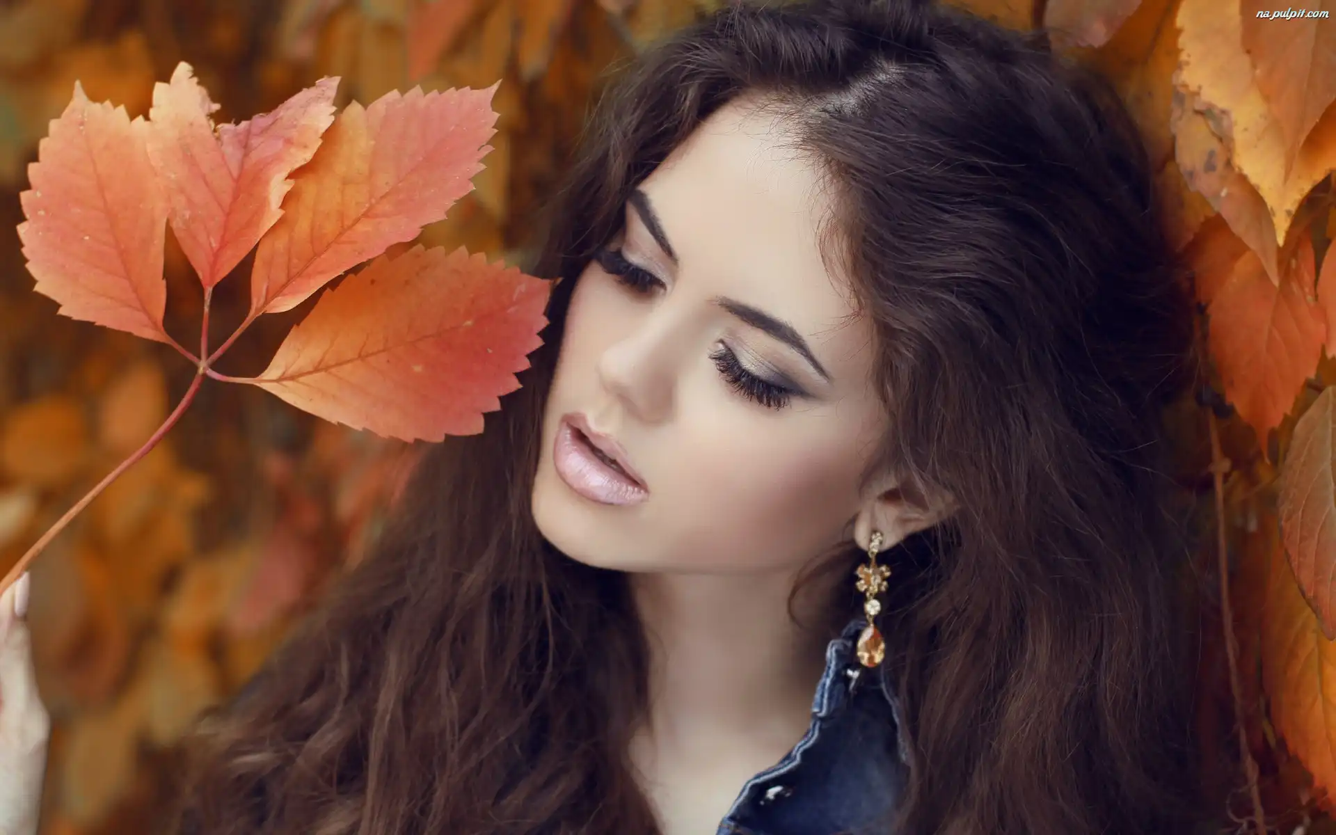 Jesień, Makijaż, Biżuteria, Modelka, Liść Na Pulpit