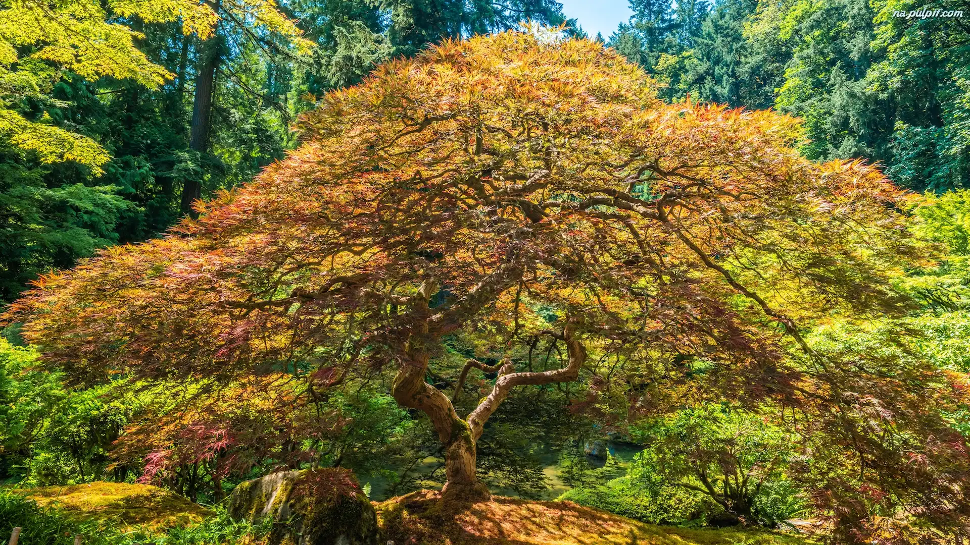 Stany Zjednoczone, Jesień, Stan Oregon, Klon palmowy, Drzewo, Ogród japoński, Portland Na Pulpit