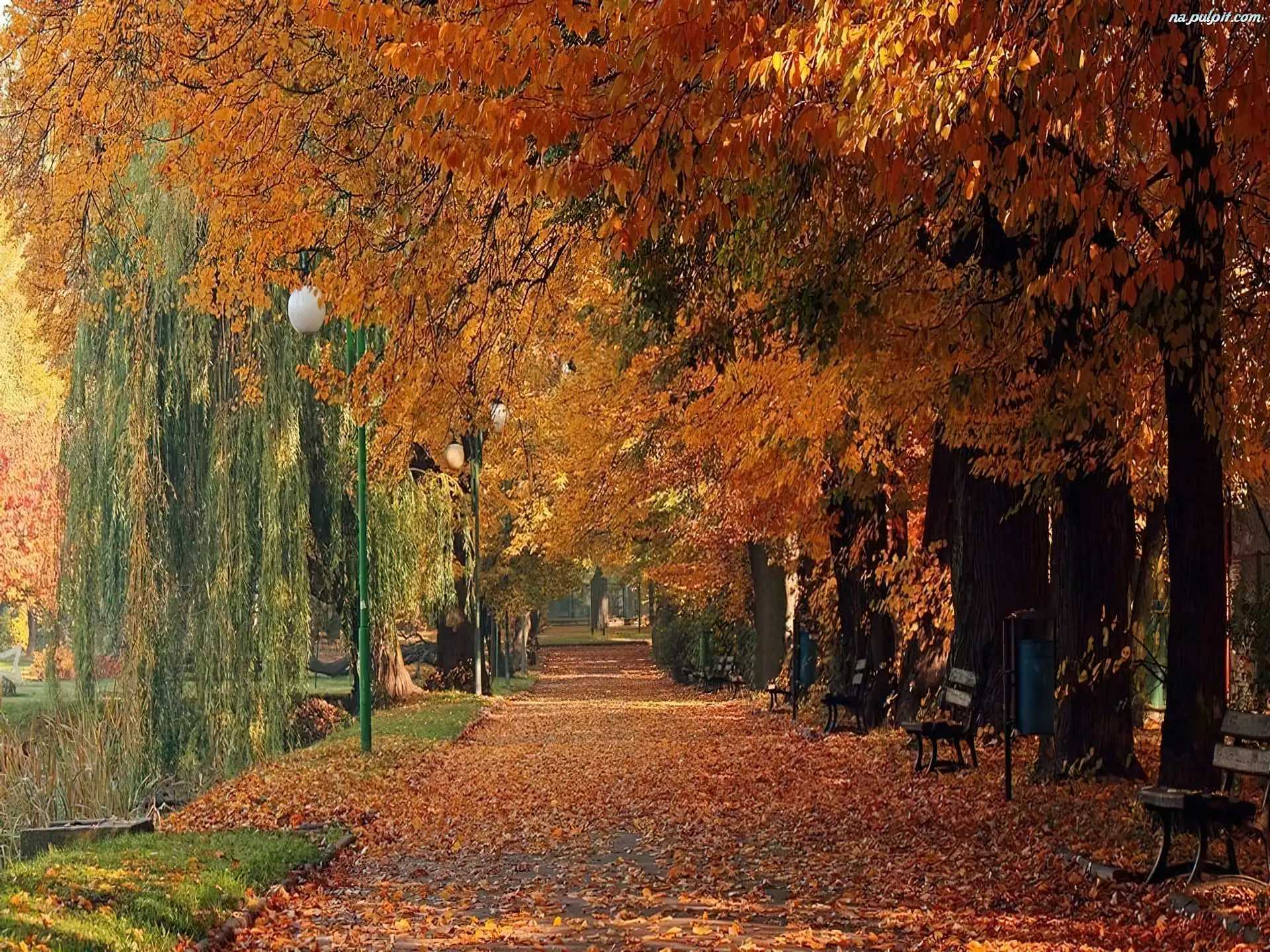 Ławki, Park, Jesień, Aleja
