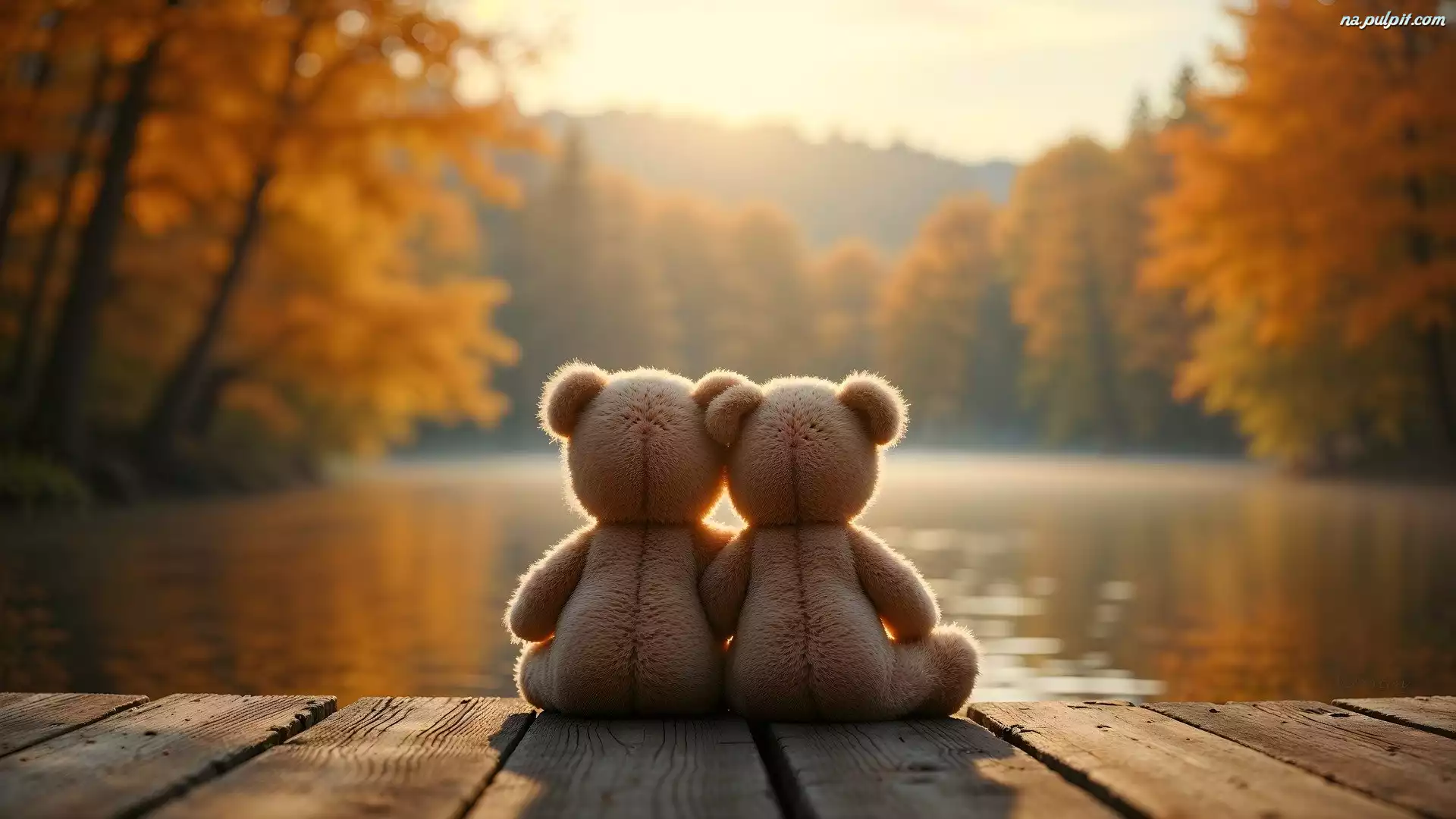 Jezioro, Misie, Pluszowe, Jesień, Dwa, Przytulone, Pomost Na Pulpit