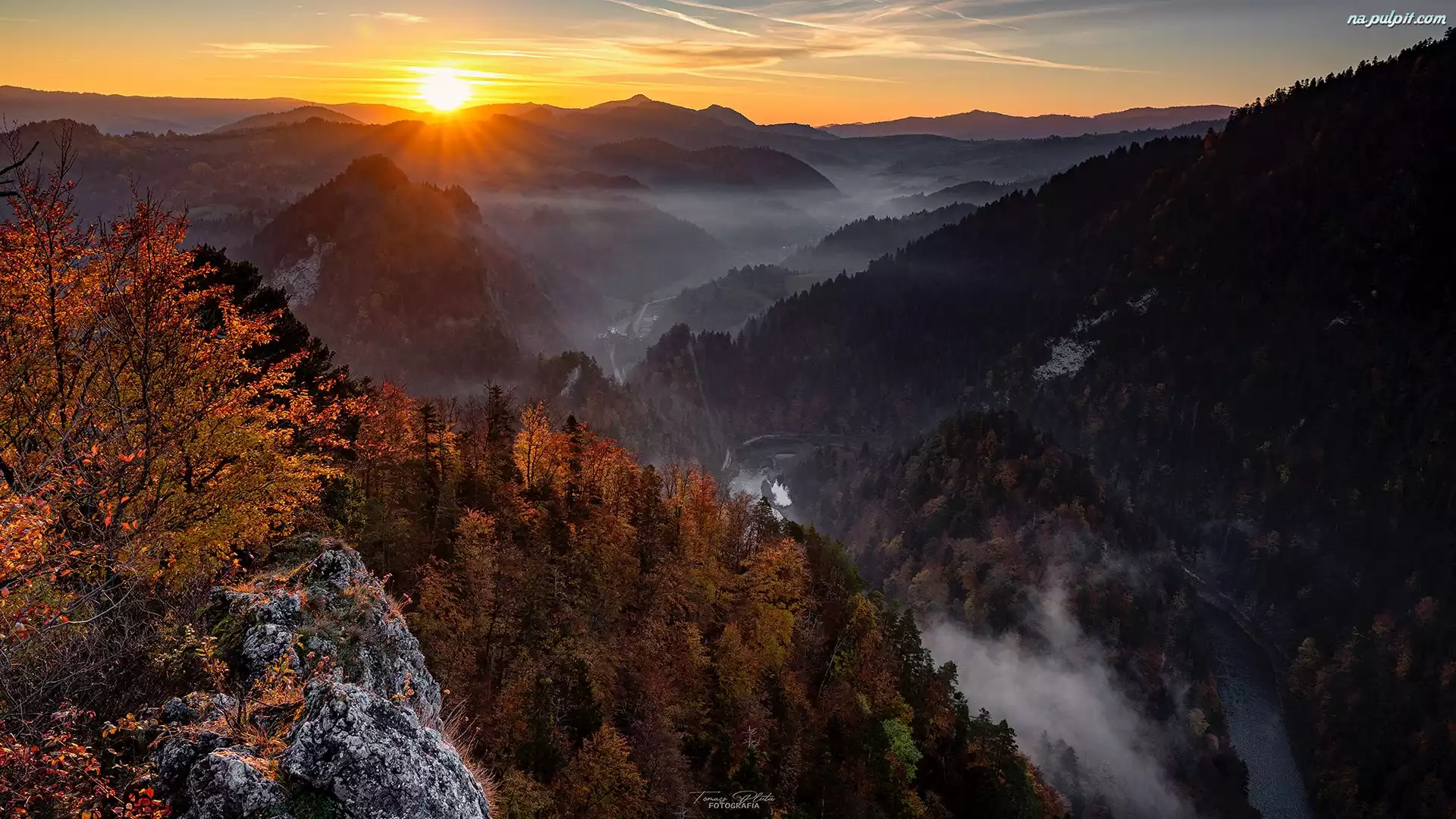 Mgła, Pieniny, Wschód słońca, Góry, Sokolica, Jesień, Polska, Szczyt, Skały, Drzewa Na Pulpit