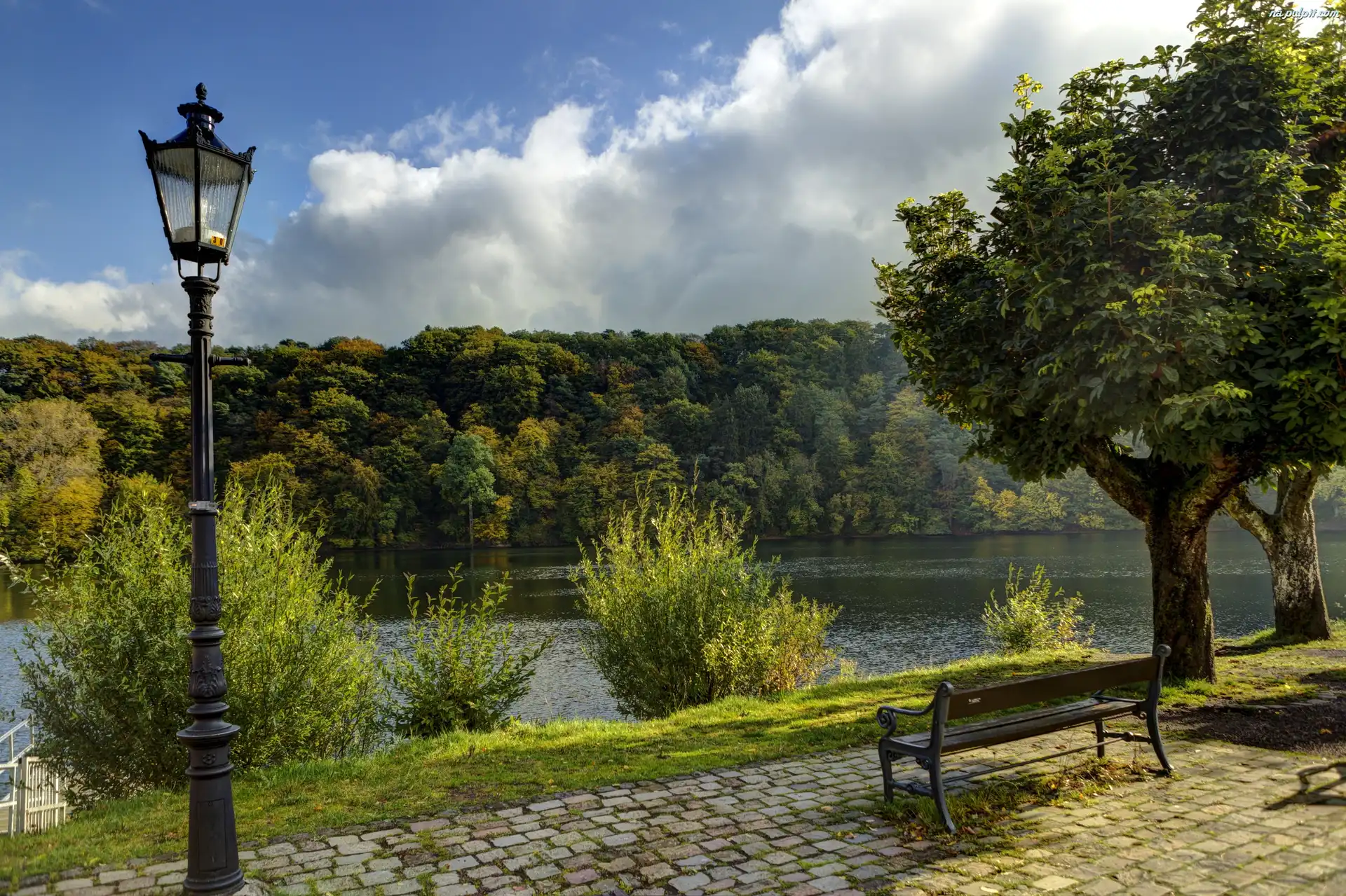 Jesień, Ławka, Drzewa, Rzeka, Latarnia