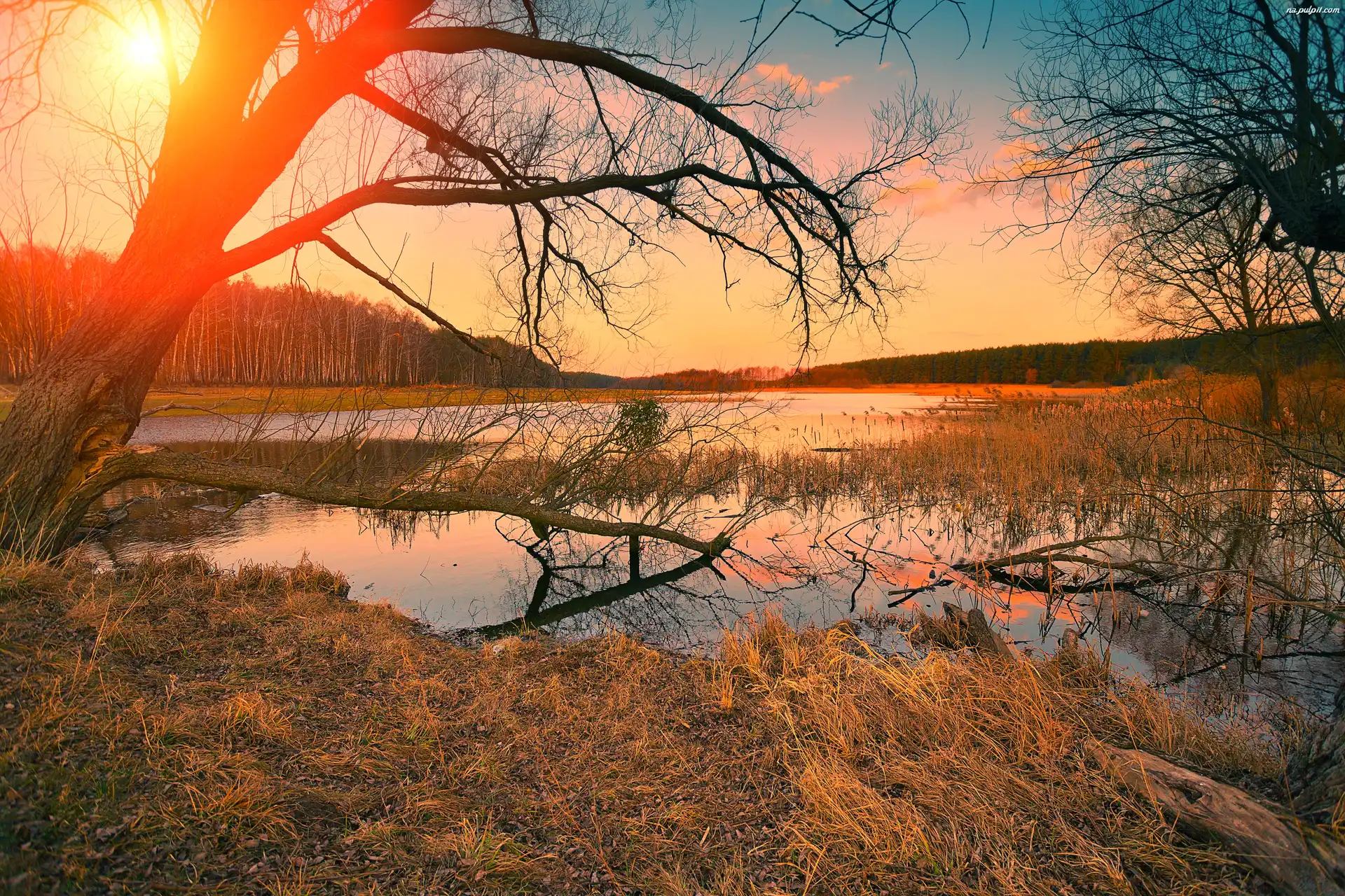 Jesień, Drzewa, Rzeka, Słońce