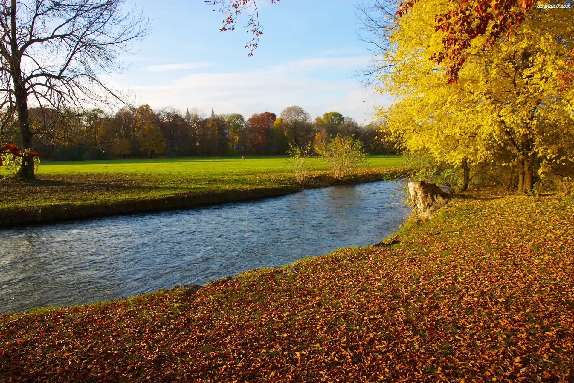 Jesień, Łąka, Las, Rzeka, Liście