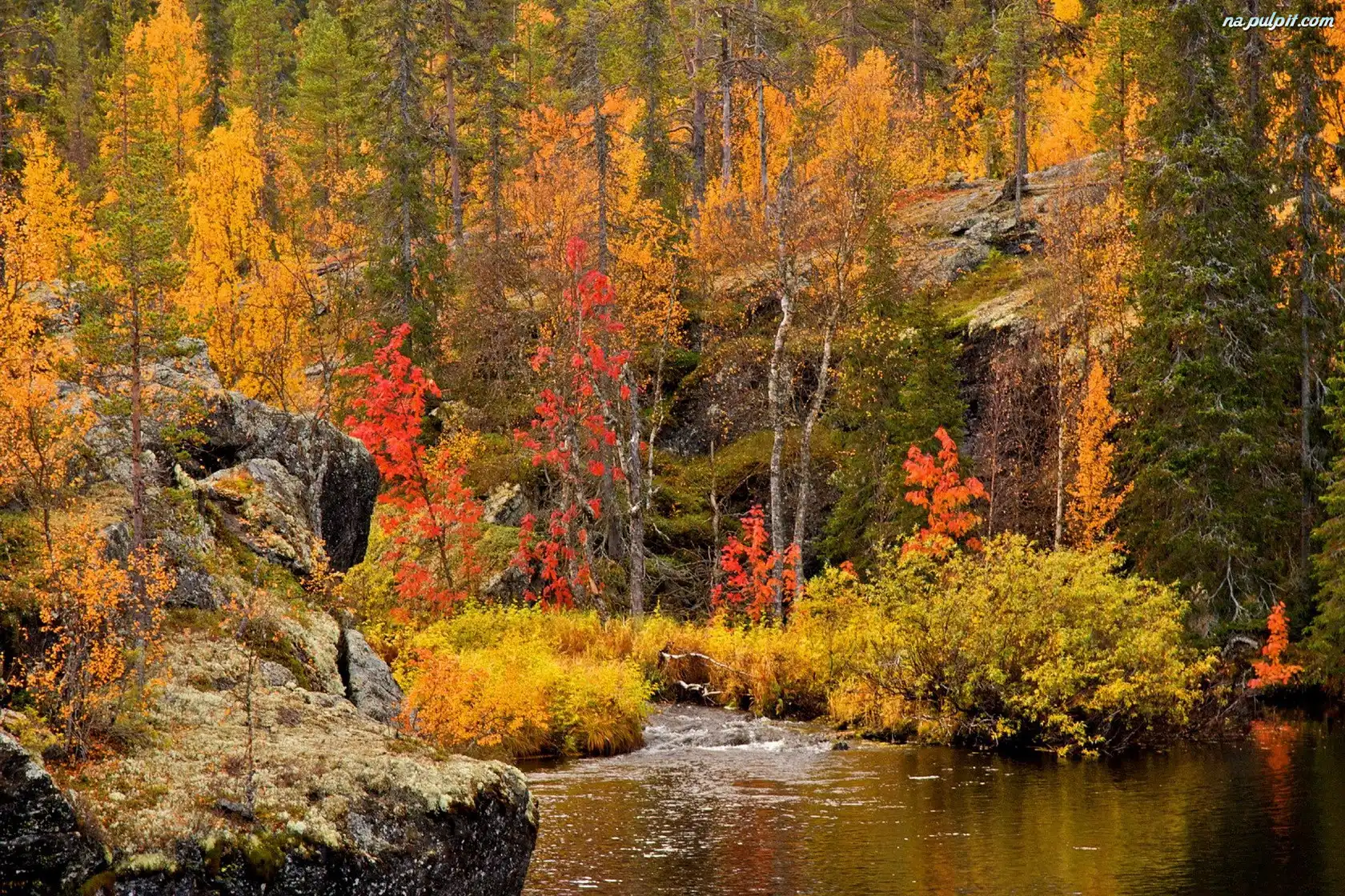 Jesień, Las, Rzeka, Skały Na Pulpit