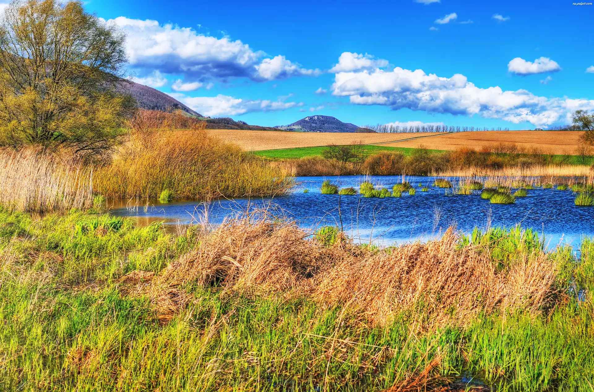 Jesień, Łąki, Pola, Rzeka, Góry