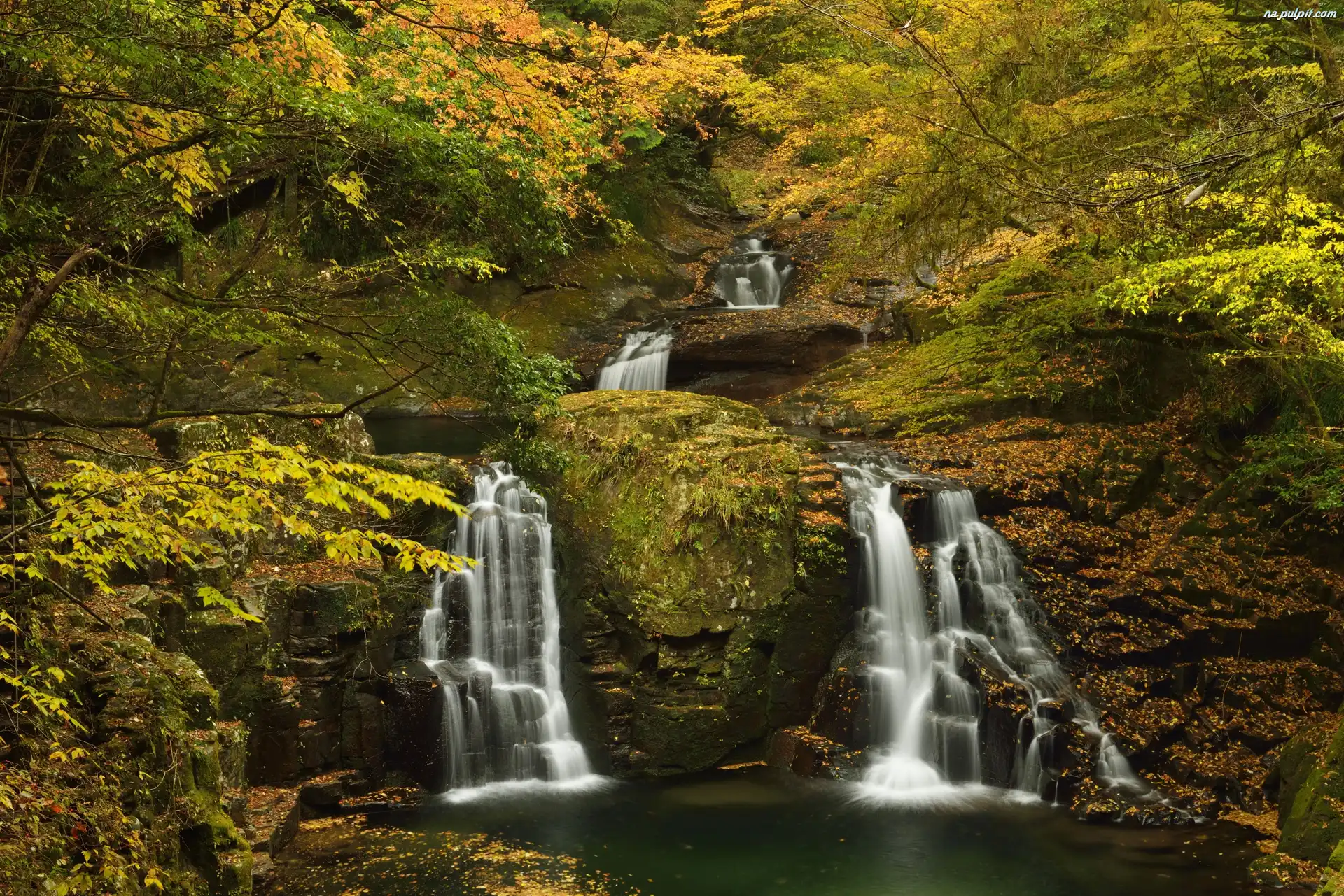 Kamyki, Jesień, Las Wysoki Wodospad Wodospad Wędkowanie, Jesień Leśna, Liście, Opadające, Ścieżka Wodospad Wodospad Kanion, Skały Jesień, Dwa, Muchomory Wodospad Drzewa, Jesienne, Liście Skaliste, Wybrzeże Jeziorko, Stroma, Skała Jesień, Las