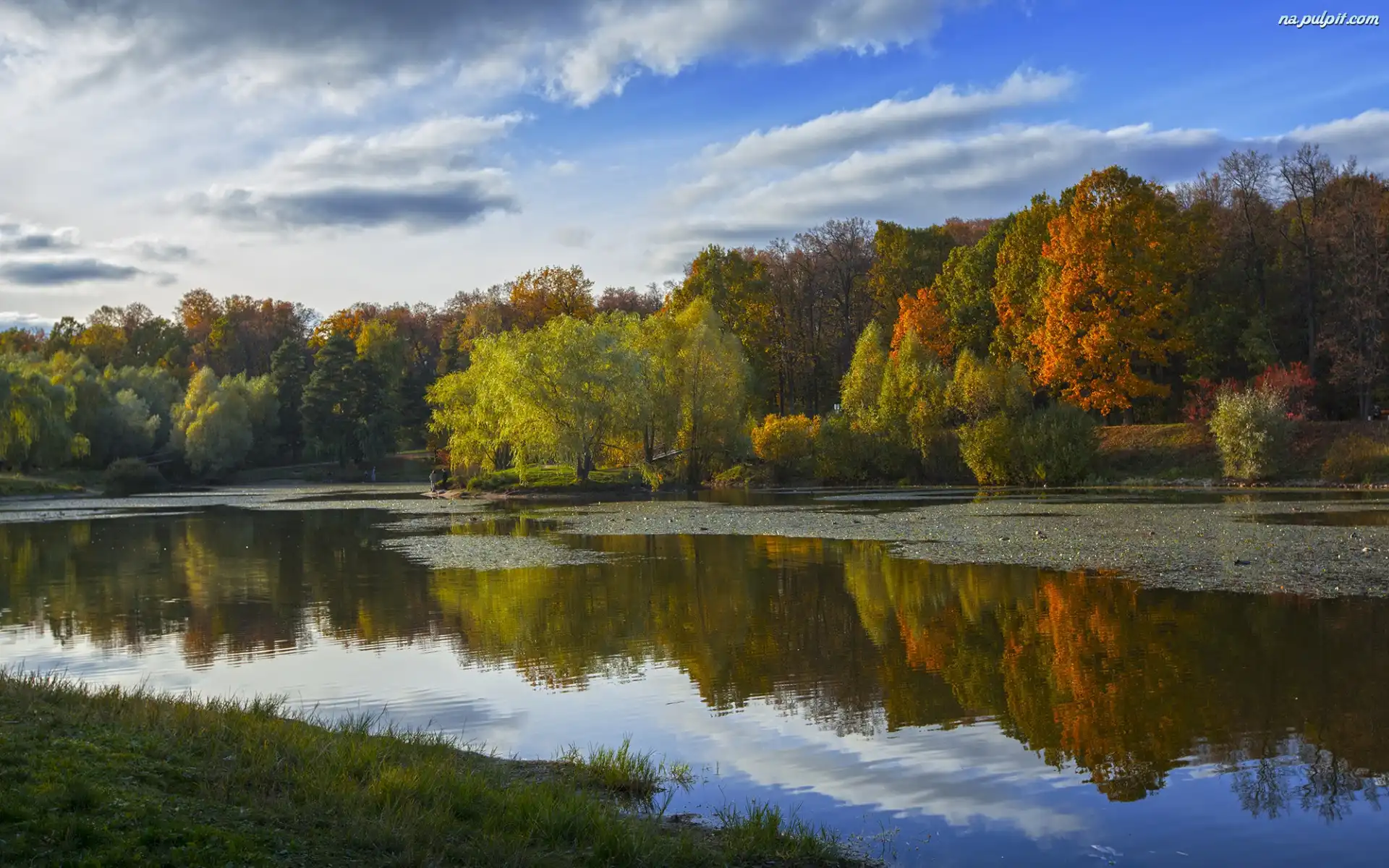 Trawa, Odbicie, Staw, Jesień, Drzewa, Park, Brzeg Na Pulpit