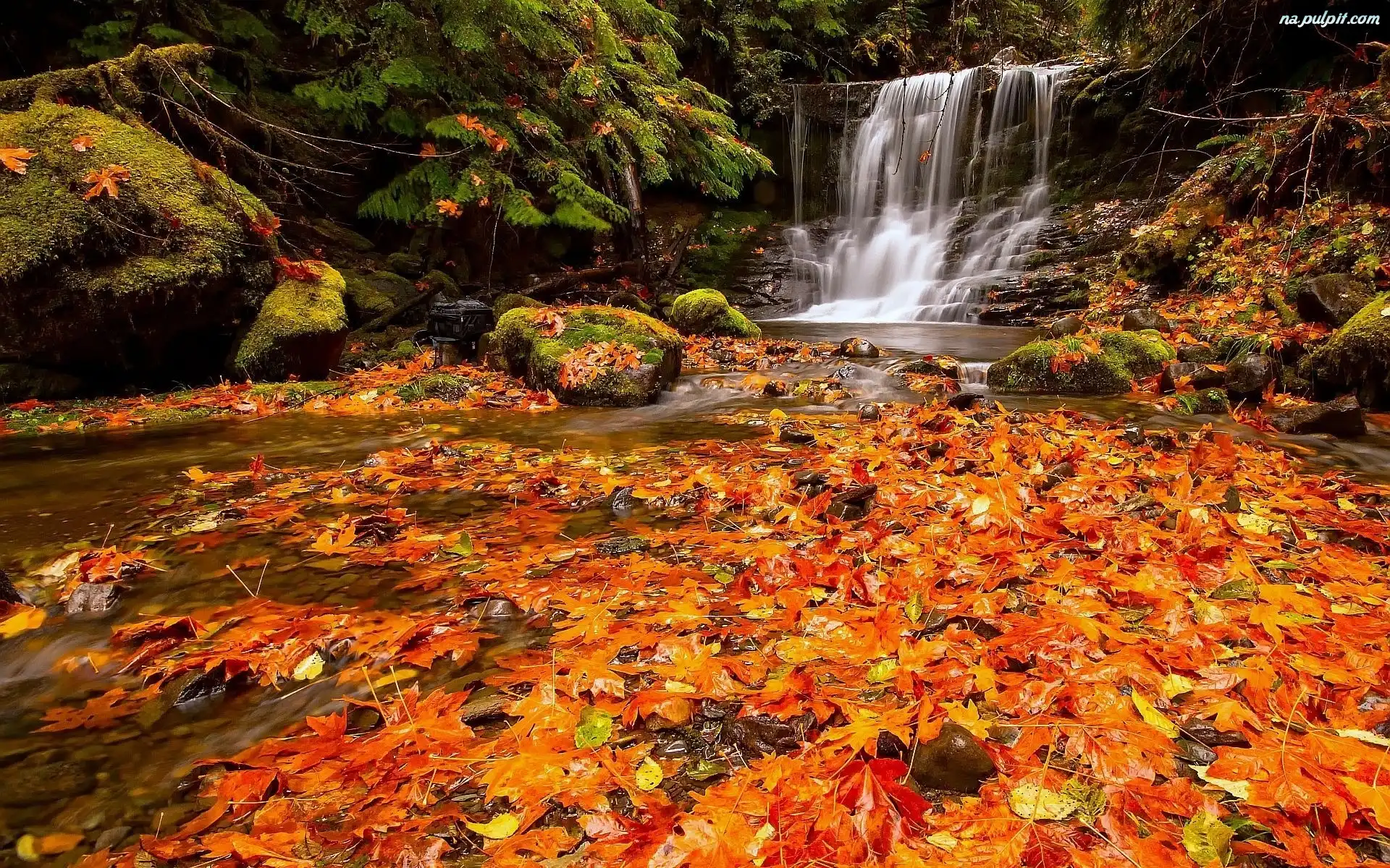 Jesień, Las, Wodospad, Liście Na Pulpit