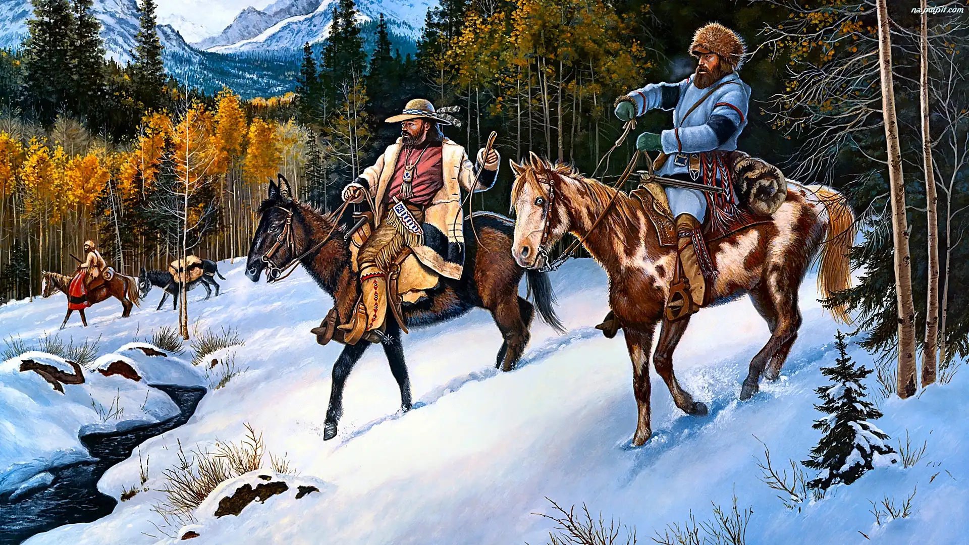 Konie, Las, Góry, Malarstwo, Jerry Crandall, Mężczyźni, Zima, Jeźdźcy