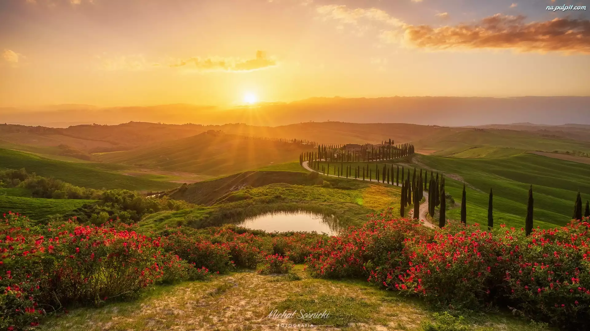 Jezioro, Baccoleno, Kwiaty, Toskania, Droga, Cyprysy, Włochy, Wzgórza, Aleja, Słońce Na Pulpit