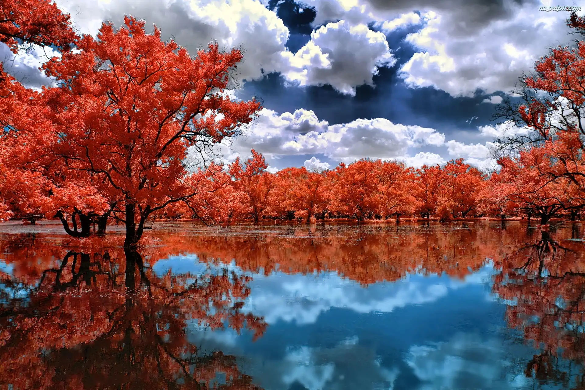Jezioro, Pomarańczowe, Chmury, Drzewa