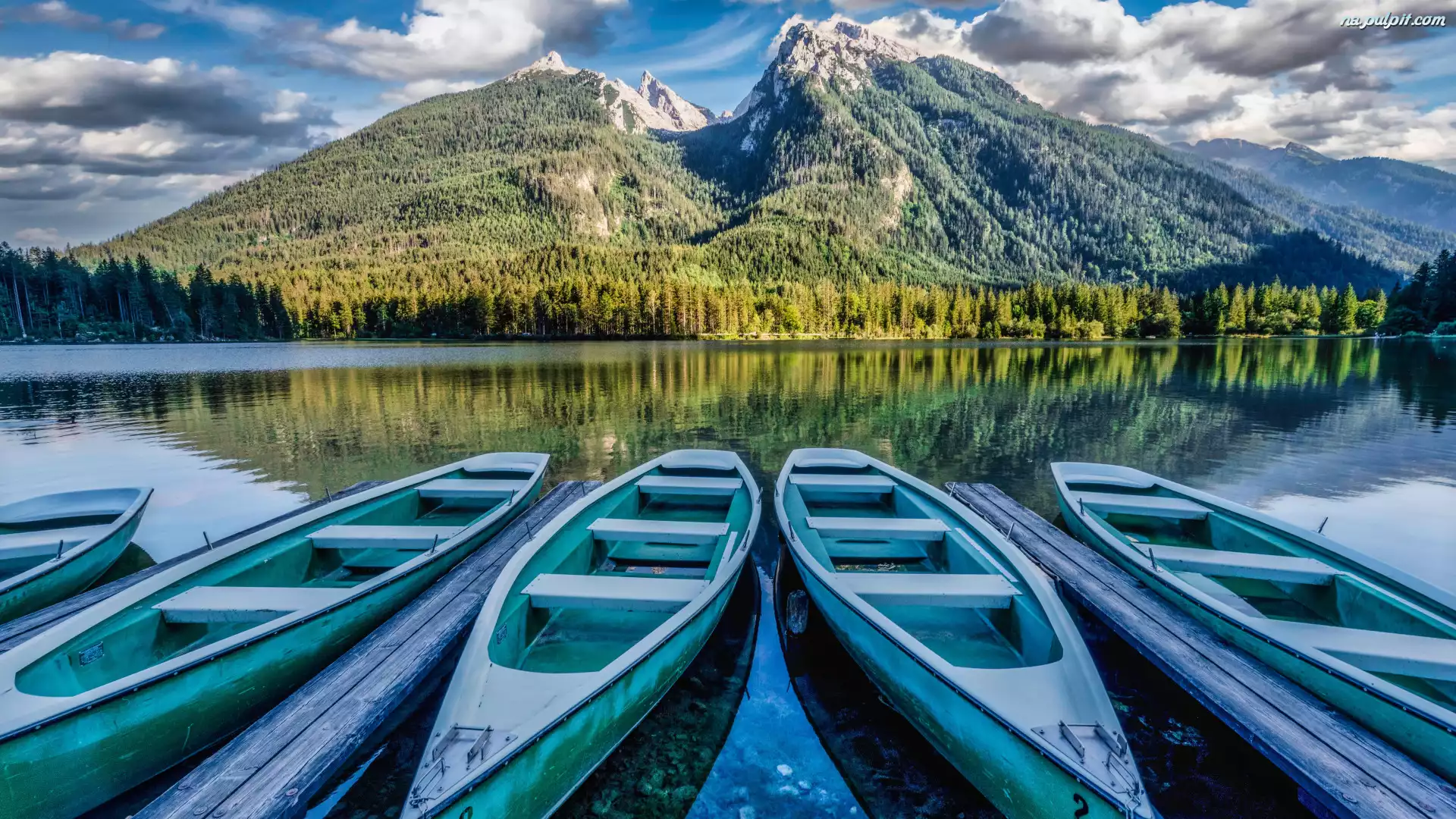 Jezioro, Mount Watzmann, Hintersee, Niemcy, Góry, Drzewa, Bawaria, Kajaki Na Pulpit