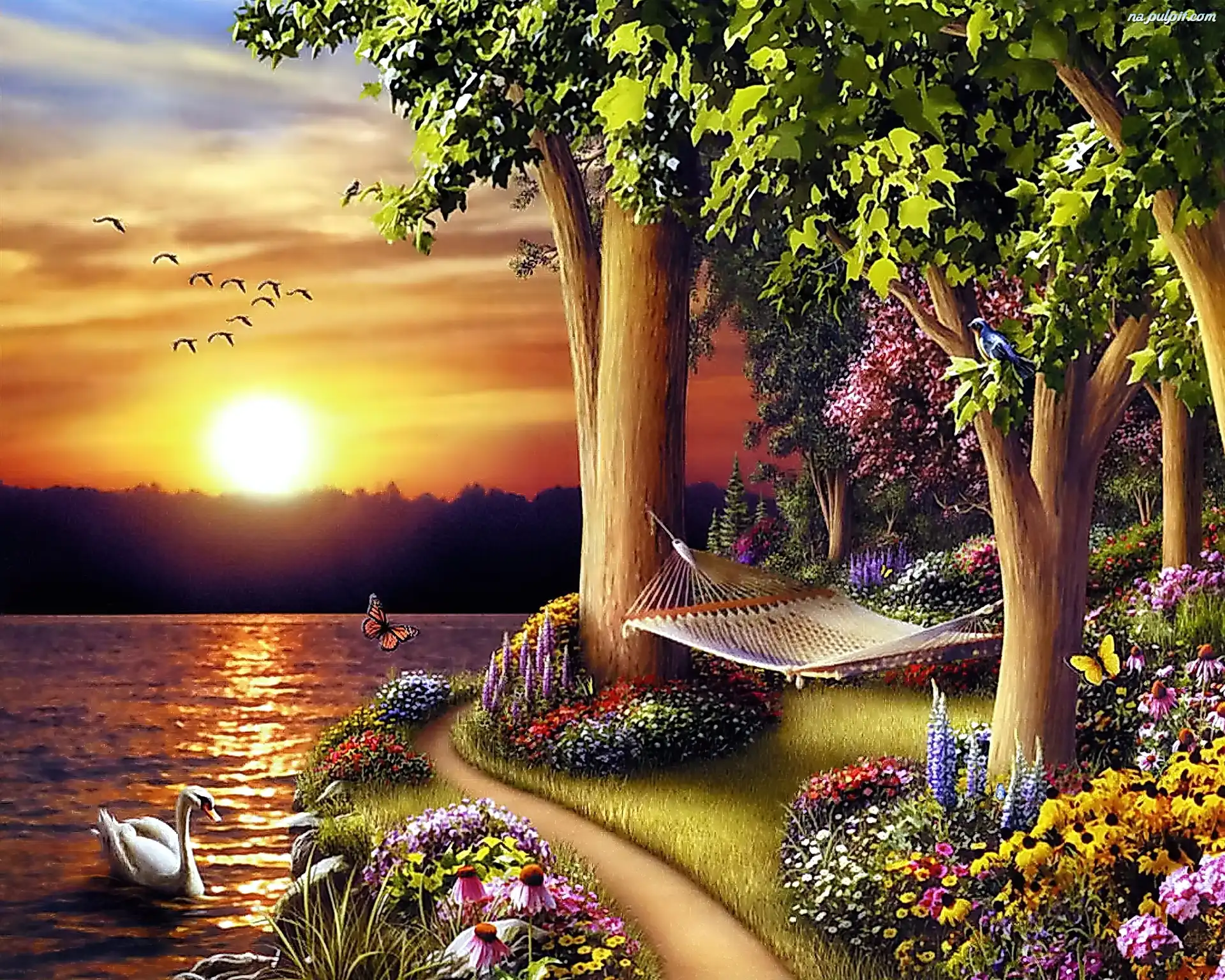 Jezioro, Hamak, Drzewa, Kwiatki Na Pulpit