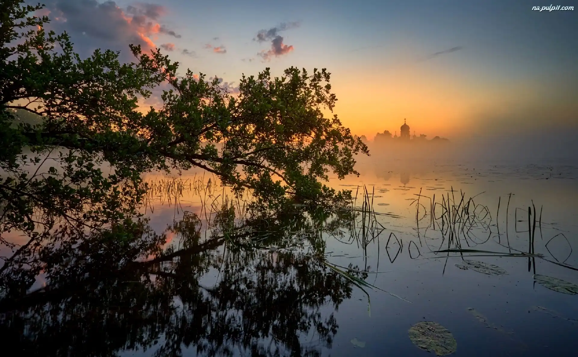 Jezioro, Słońca, Mgła, Kościół, Drzewa, Wschód