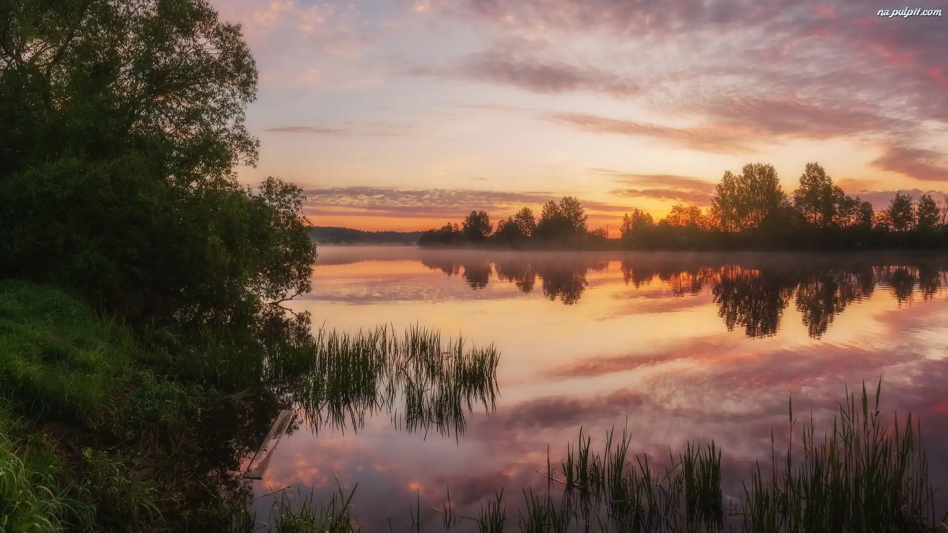 Trawa, Zachód słońca, Jezioro, Odbicie, Drzewa Na Pulpit