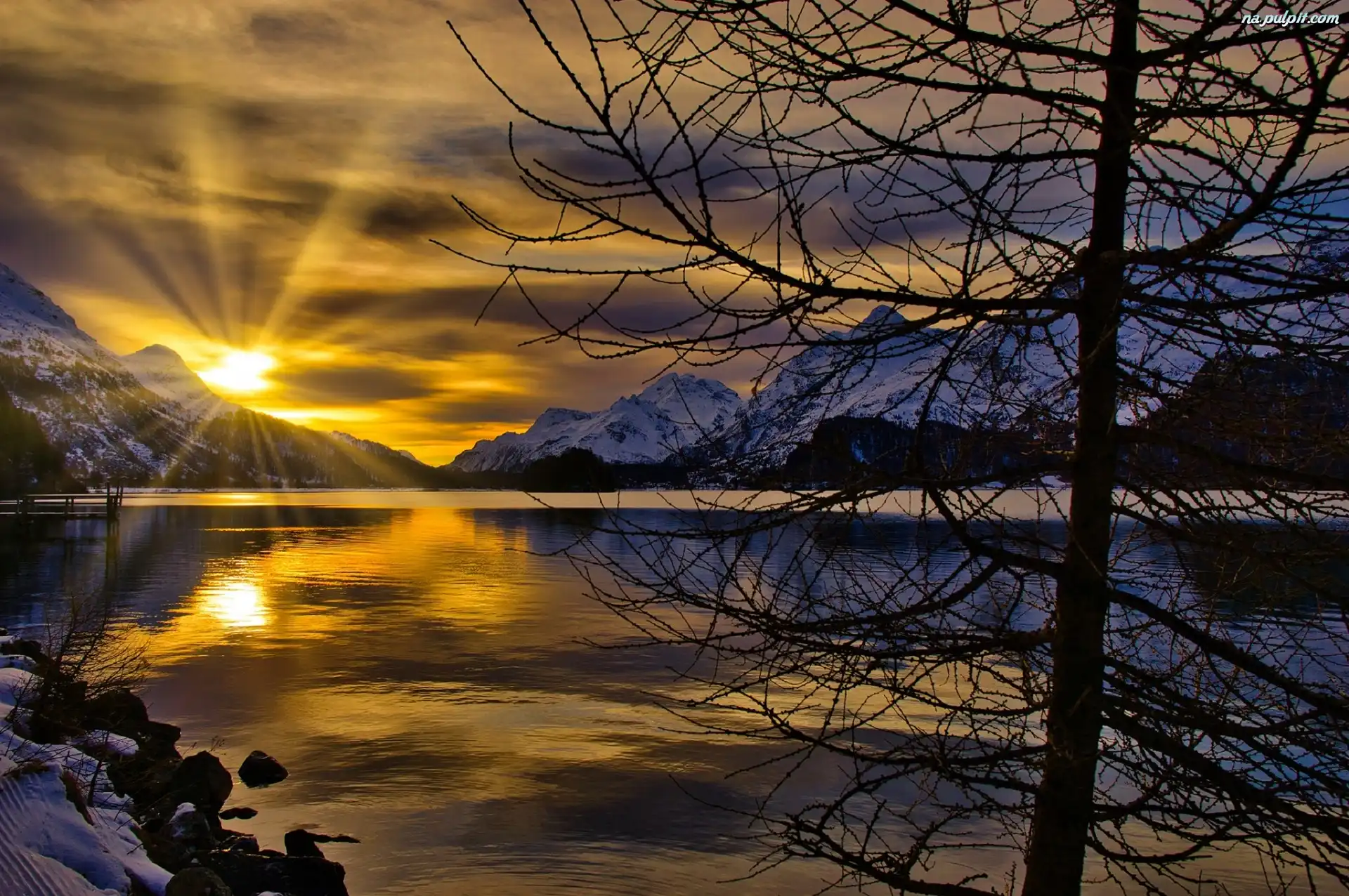 Promienie, Jezioro, Wschód słońca, Śnieg, Góry, Zima, Drzewo Na Pulpit