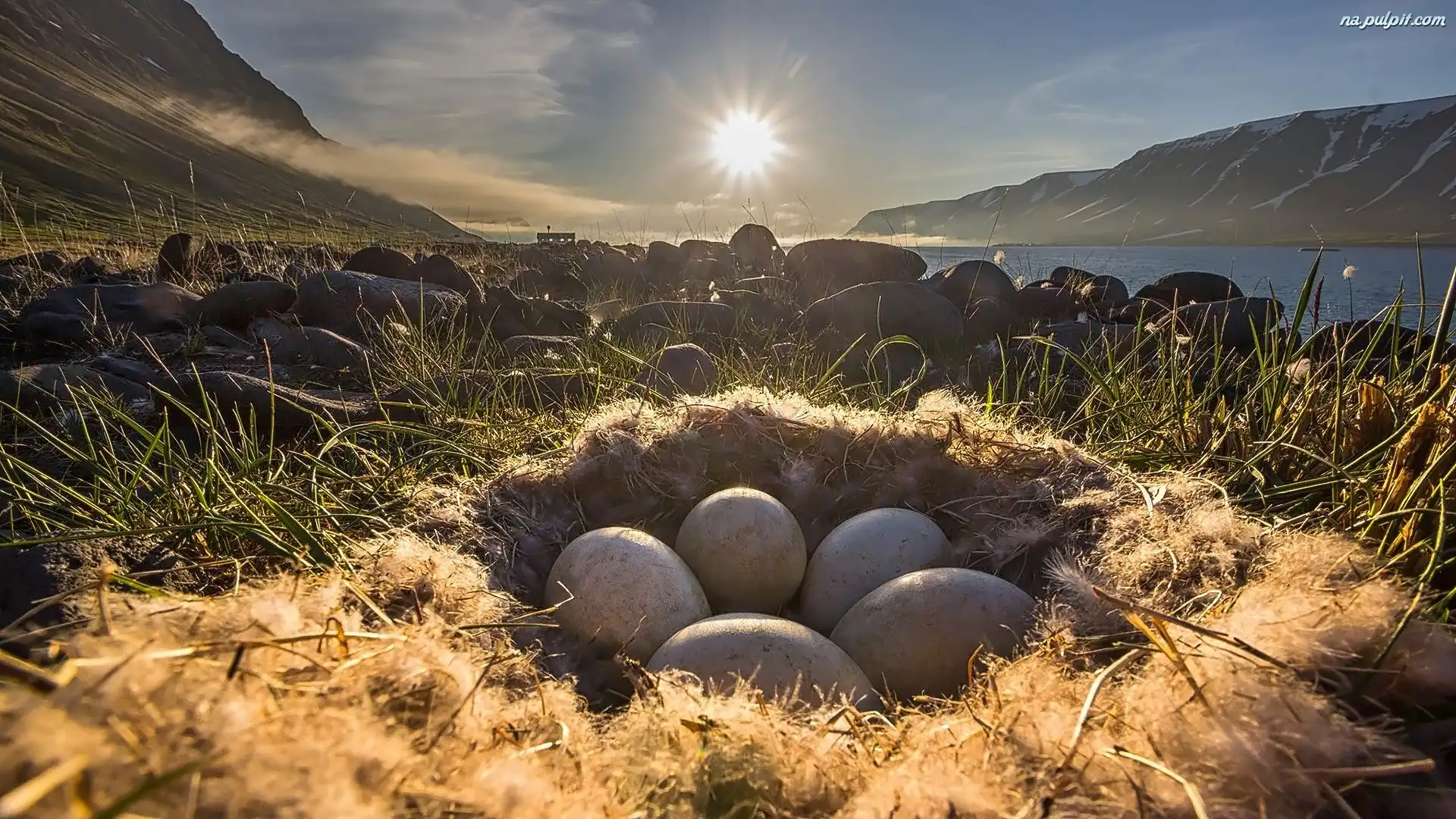 Jezioro, Jajka, Piórka, Gniazdo, Góry
