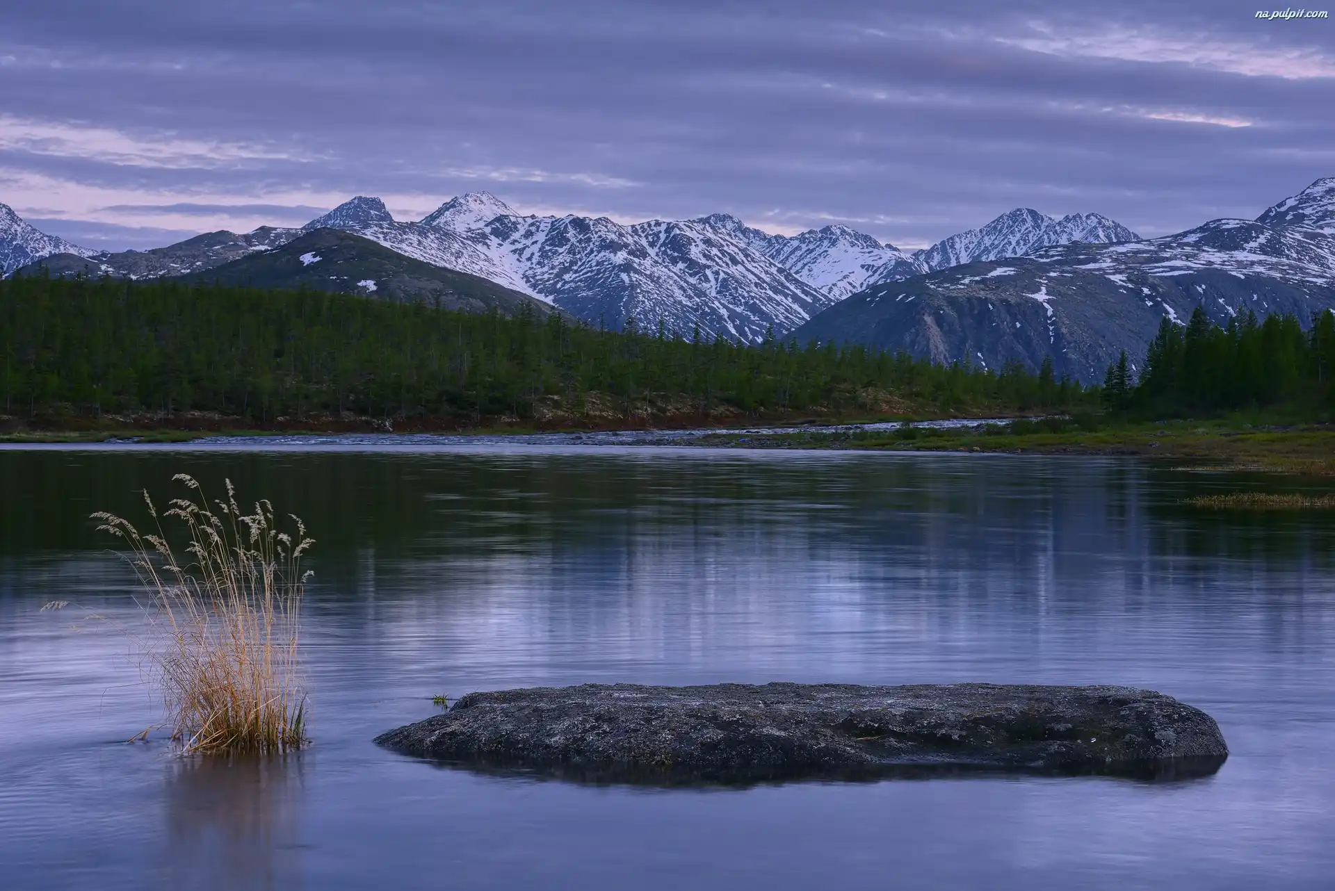 Góry Kołymskie, Kępka, Drzewa, Jezioro Jacka Londona, Kołyma, Obwód magadański, Rosja, Skała, Ośnieżone, Trawy Na Pulpit |
