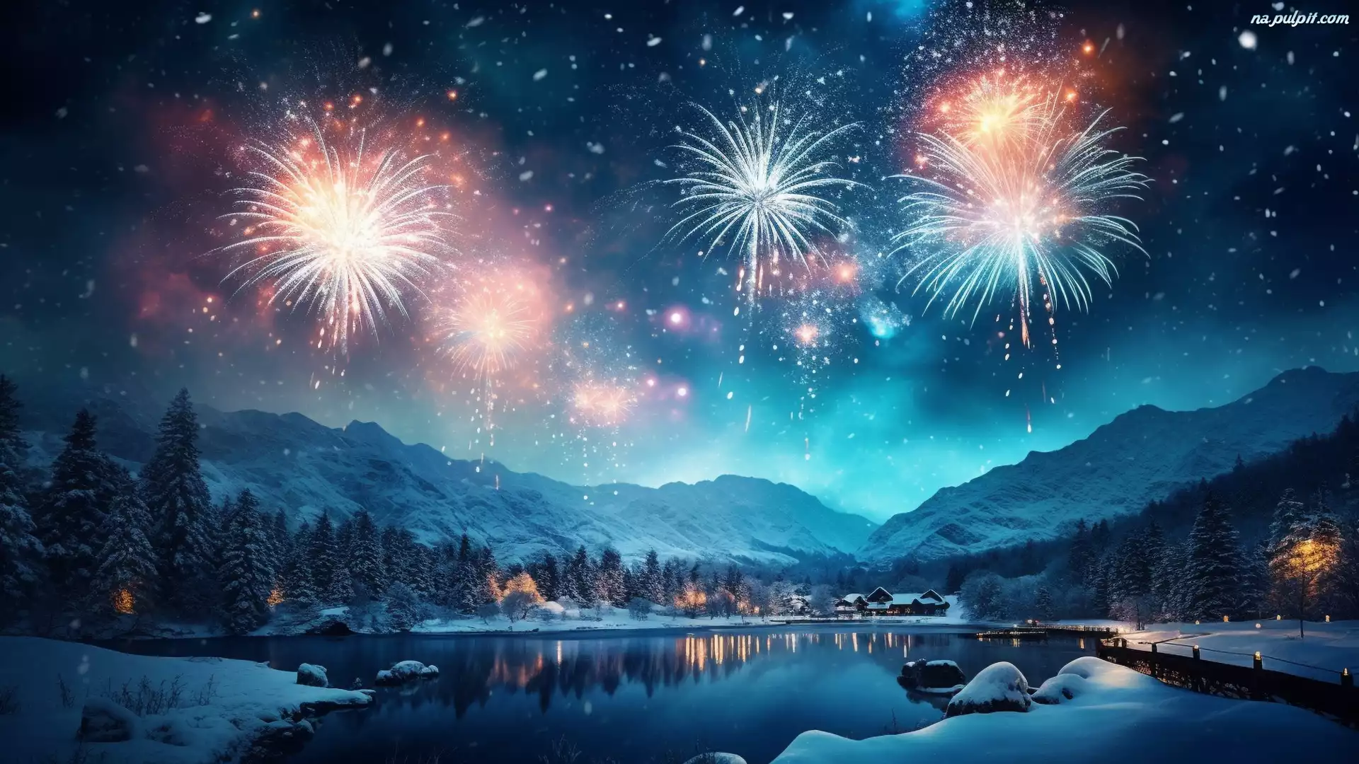 Domy, Fajerwerki, Góry, Zima, Noc, Las, Śnieg, Jezioro Na Pulpit