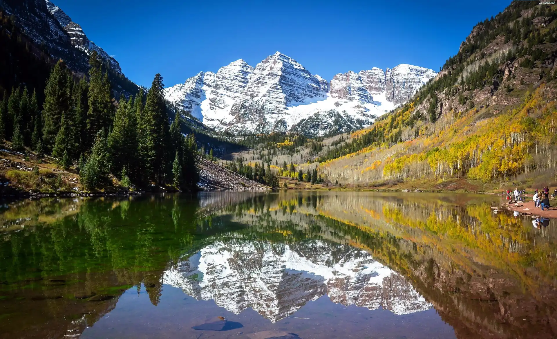 Jezioro, Śnieg, Ludzie, Drzewa, Góry, Odbicie Na Pulpit