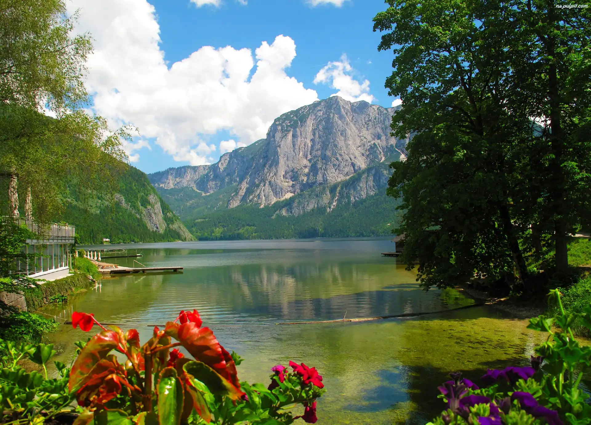 Jezioro, Drzewa, Niebo, Chmury, Góry, Kwiaty Na Pulpit