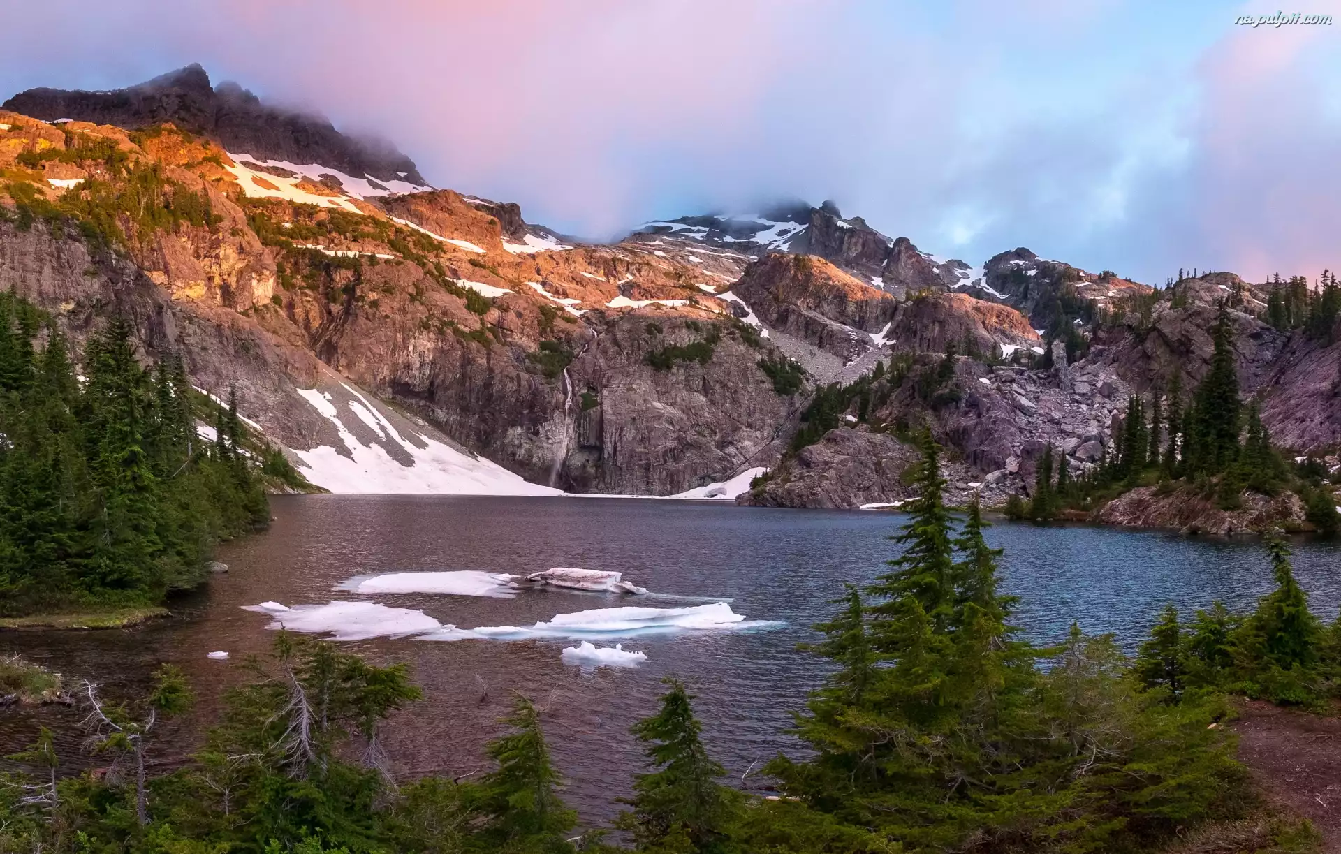 Śnieg, Góry, Jezioro, Świerki Na Pulpit