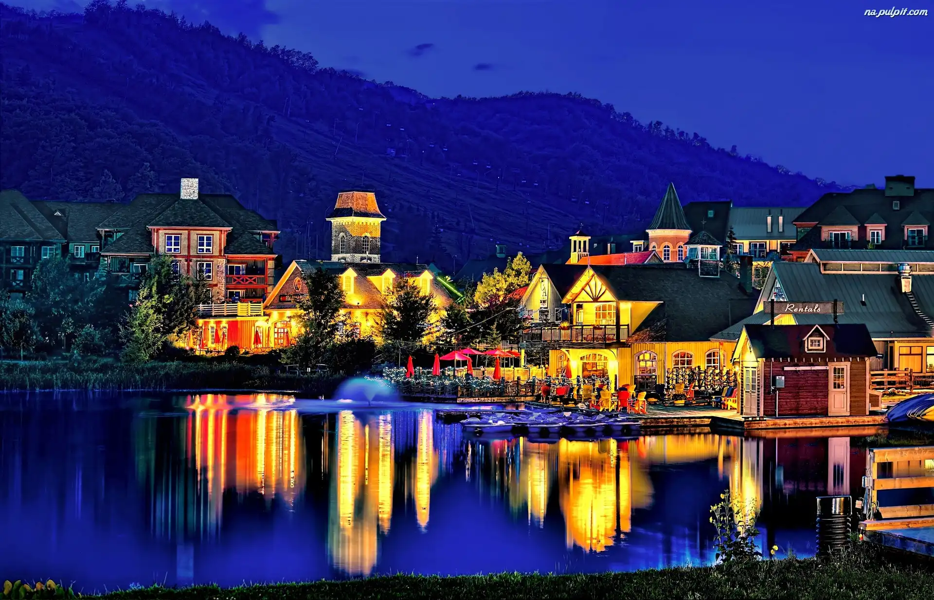 Jezioro, Domy, Odbicie, Wieczór, Góry, Oświetlone
