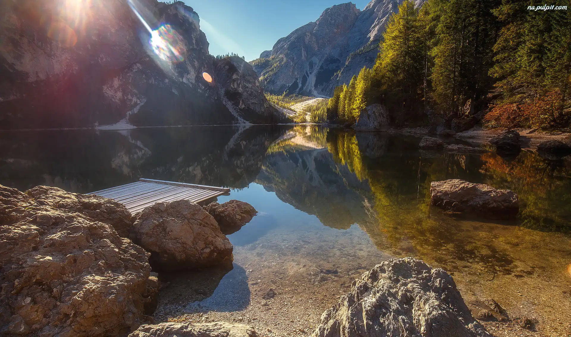 Jezioro, Promienie słońca, Drzewa, Góry, Kamienie Na Pulpit