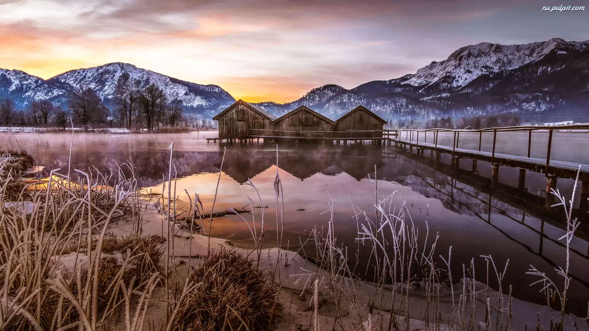 Wschód słońca, Jezioro Kochelsee, Góry, Drzewa, Bawaria, Niemcy, Pomost, Schlehdorf, Domki Na Pulpit |