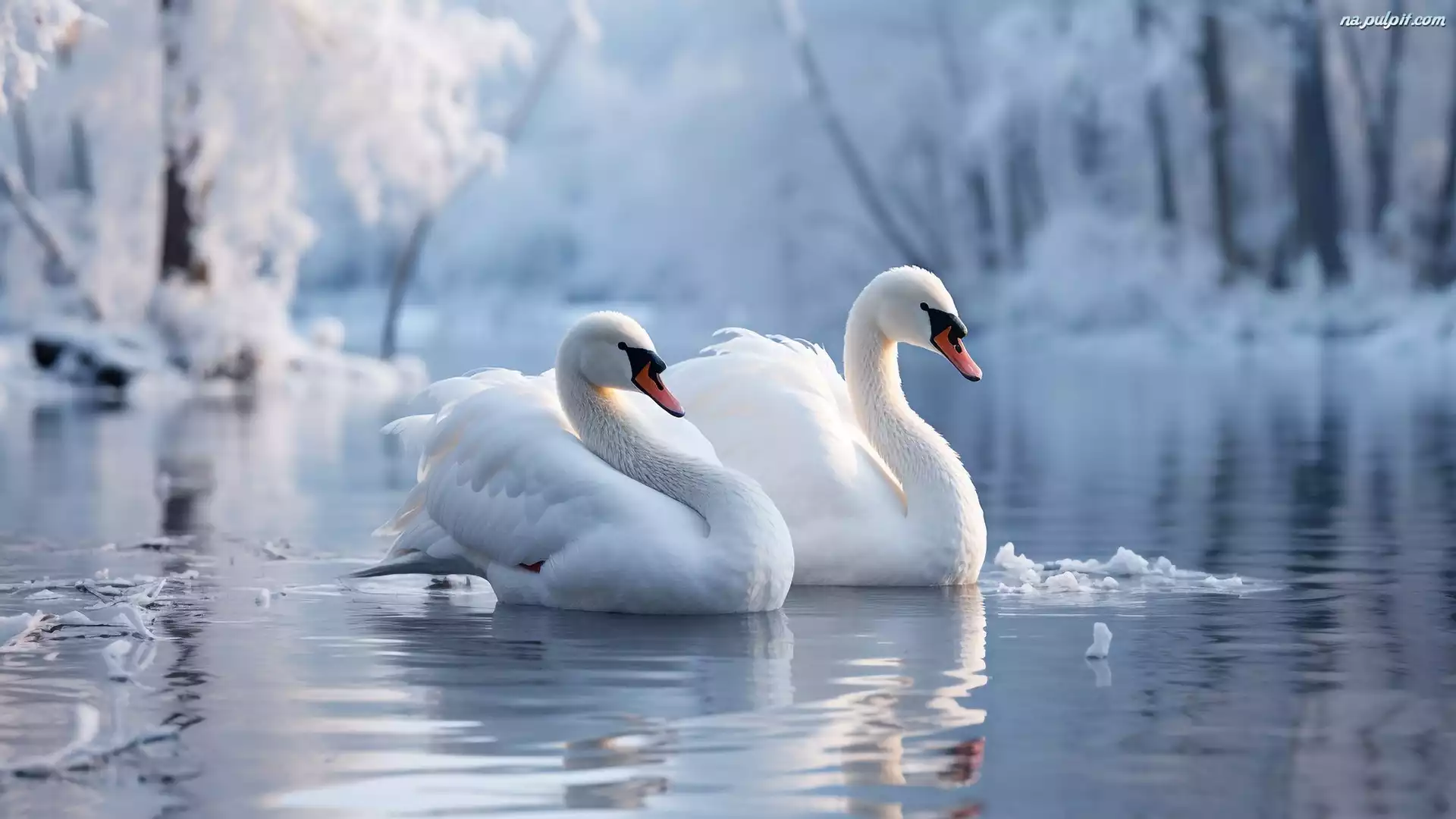 Zima, Dwa, Łabędzie, Jezioro, Białe, Grafika Na Pulpit