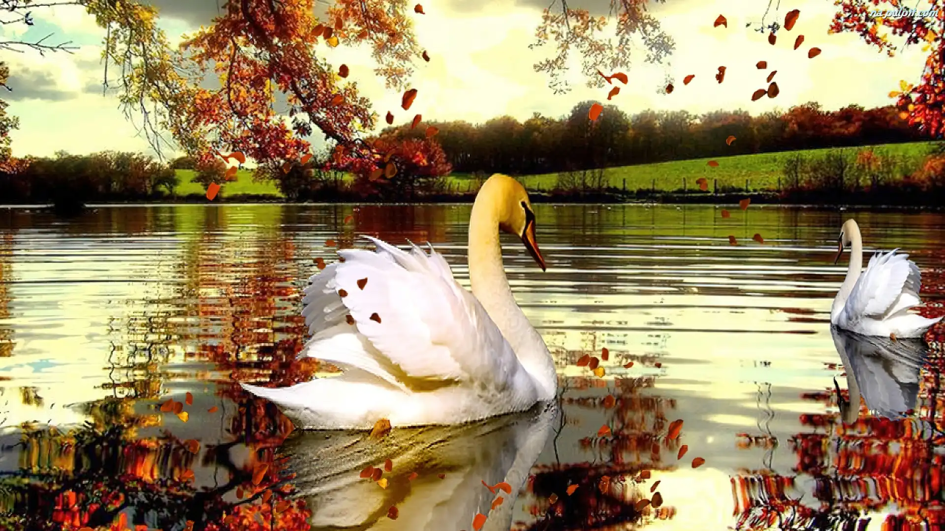 Łabędzie, Jesień, Jezioro, Dwa