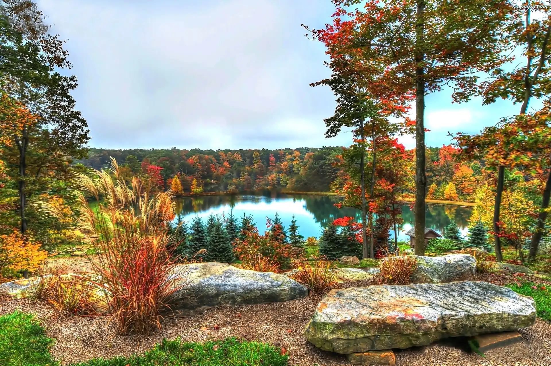 Jezioro, Trawa, Las, Kamienie, Jesień, Drzewa