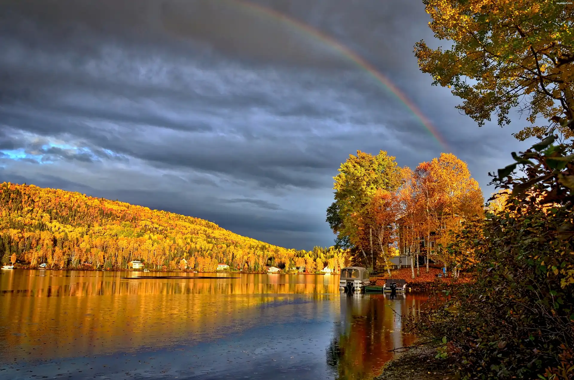 Jezioro, Chmury, Tęcza, Drzewa, Jesień, Niebo Na Pulpit