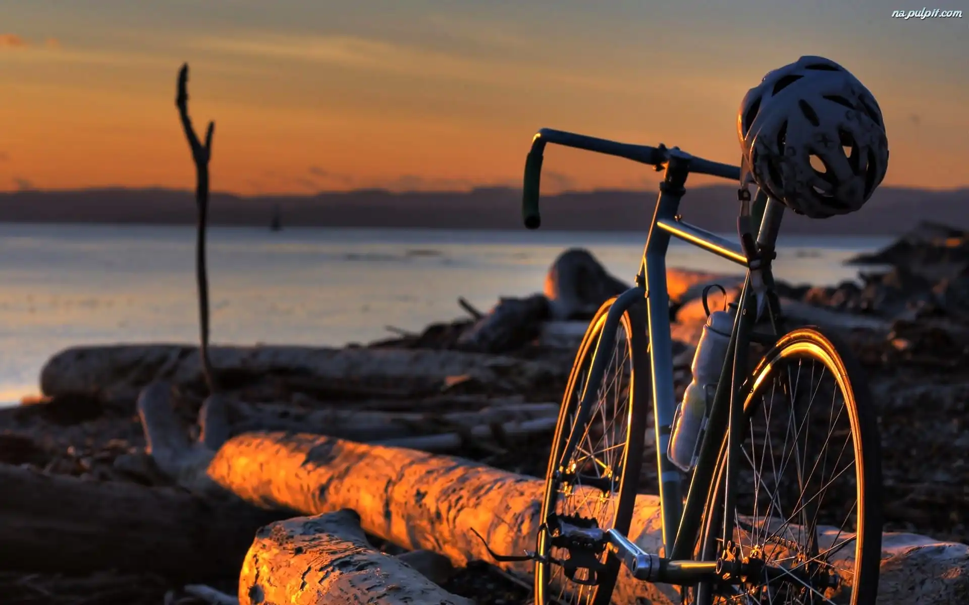 Kask, Jezioro, Drzewo, Wybrzeże, Rower, Zachód Slońca Na Pulpit