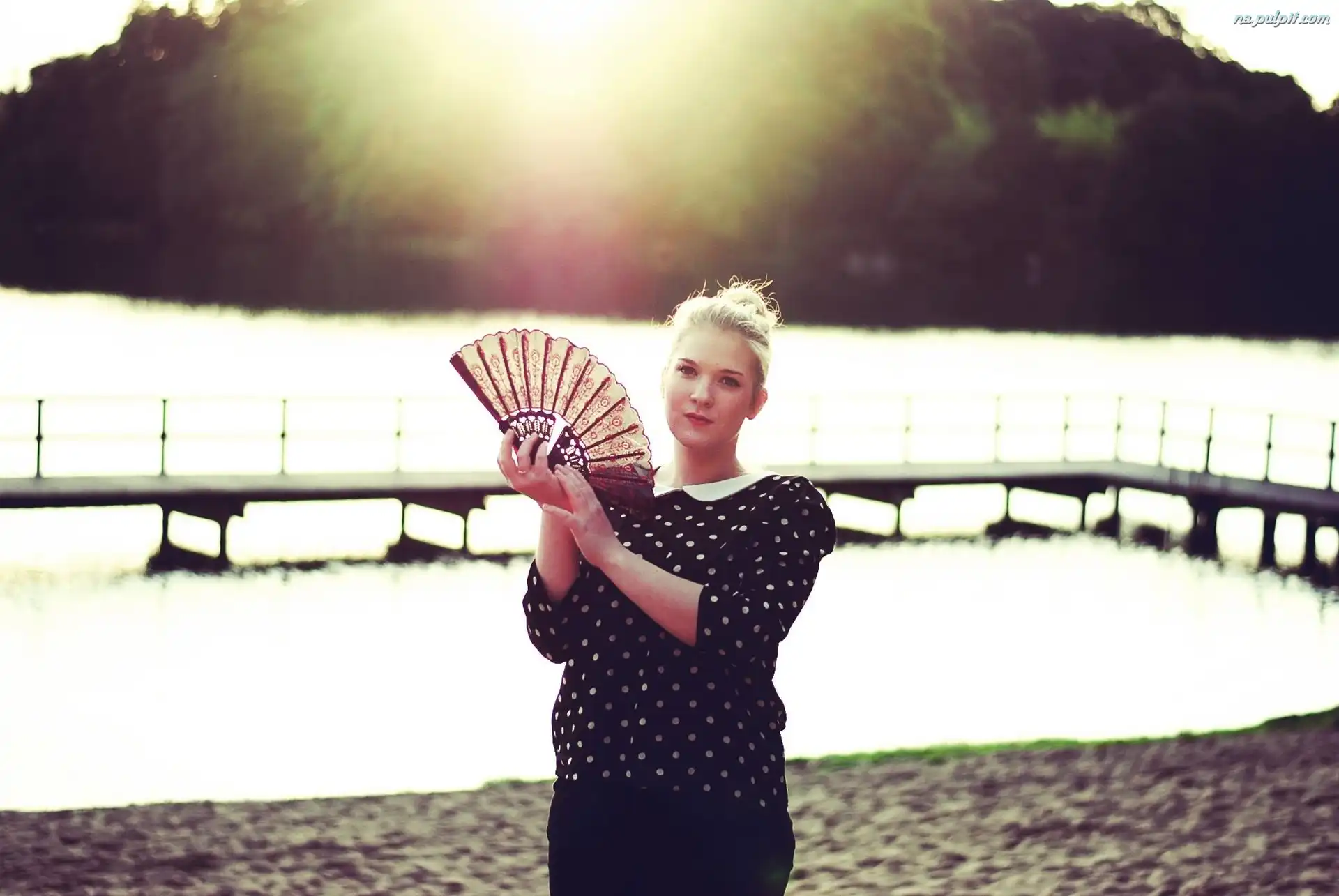 Jezioro, Wachlarz, Blondynka, Kobieta, Molo