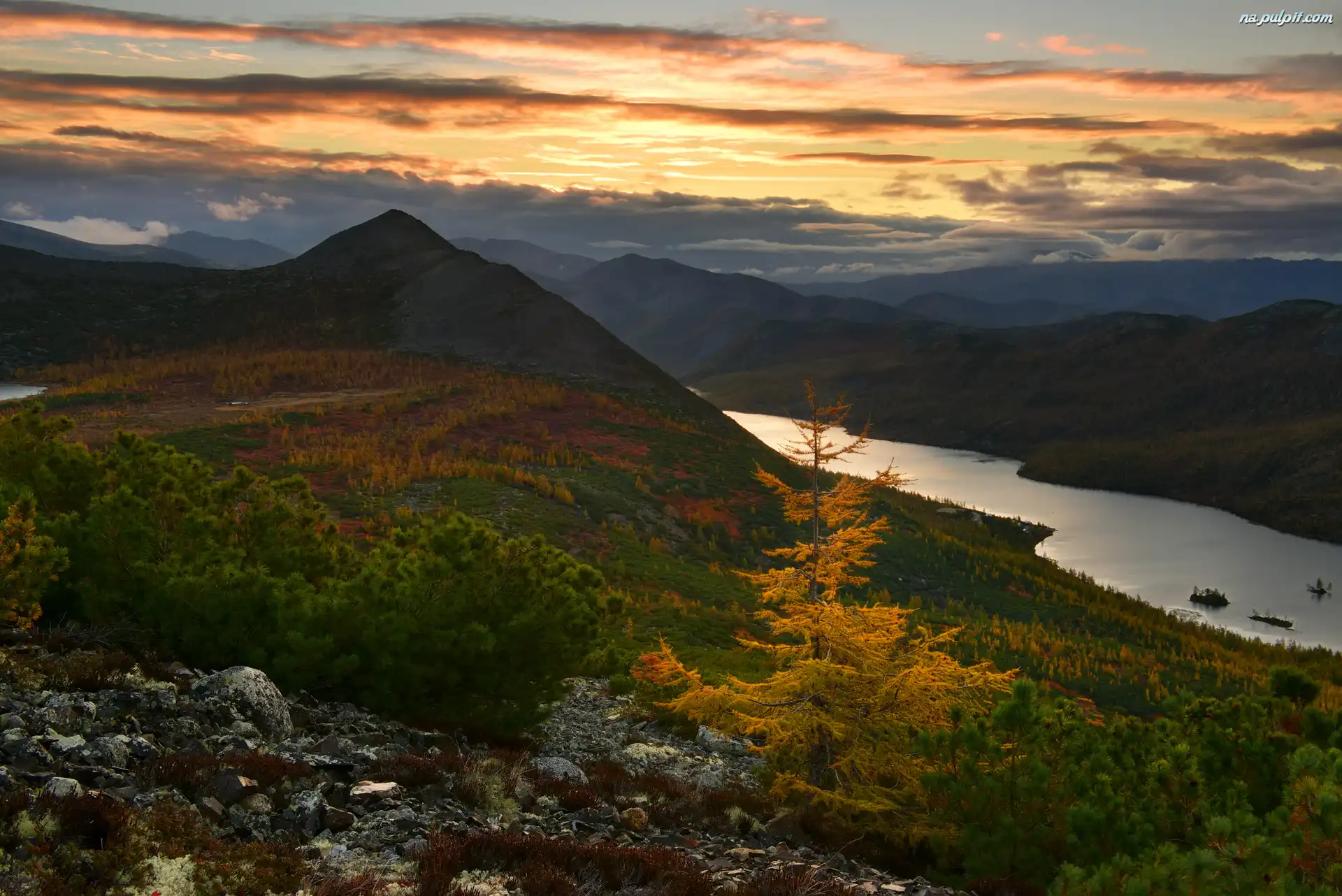 Jezioro Tantsuyushchikh Khariusov, Wzgórza, Rosja, Drzewa, Krzewy, Kołyma, Obwód magadański, Kamienie, Świt, Góry Kołymskie, Jesień Na Pulpit |