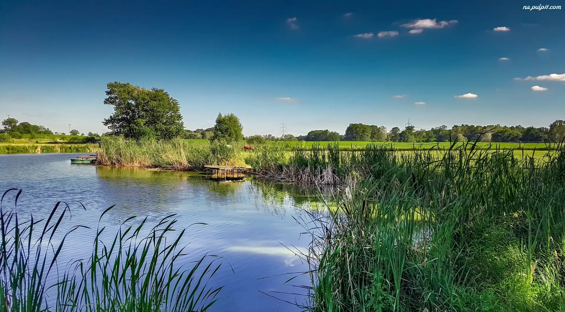 Łódka, Konie, Łąka, Jezioro, Pomost Na Pulpit