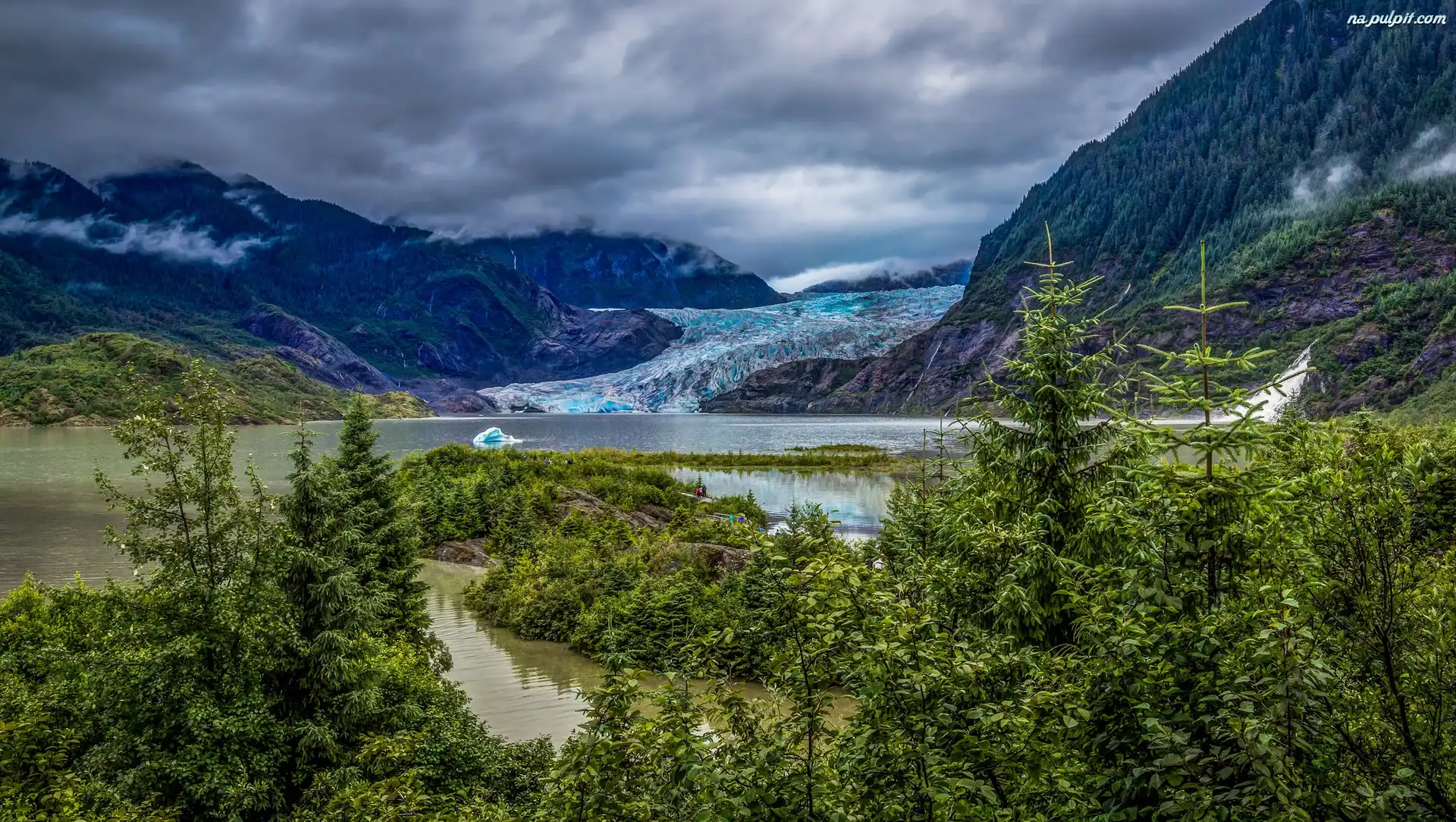 Stany Zjednoczone, Jezioro Eklutna Lake, Stan Alaska, Drzewa, Lodowiec, Góry, Chmury Na Pulpit